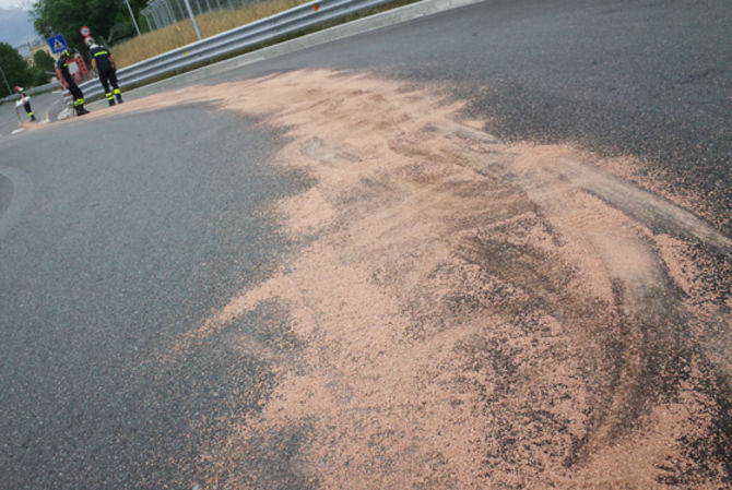 Intervento dei Vigili del fuoco nel primo pomeriggio di oggi, sulla strada statale 27 del Gran San Bernardo, all’altezza di regione Saraillon, per uno sversamento di carburante sul manto stradale.