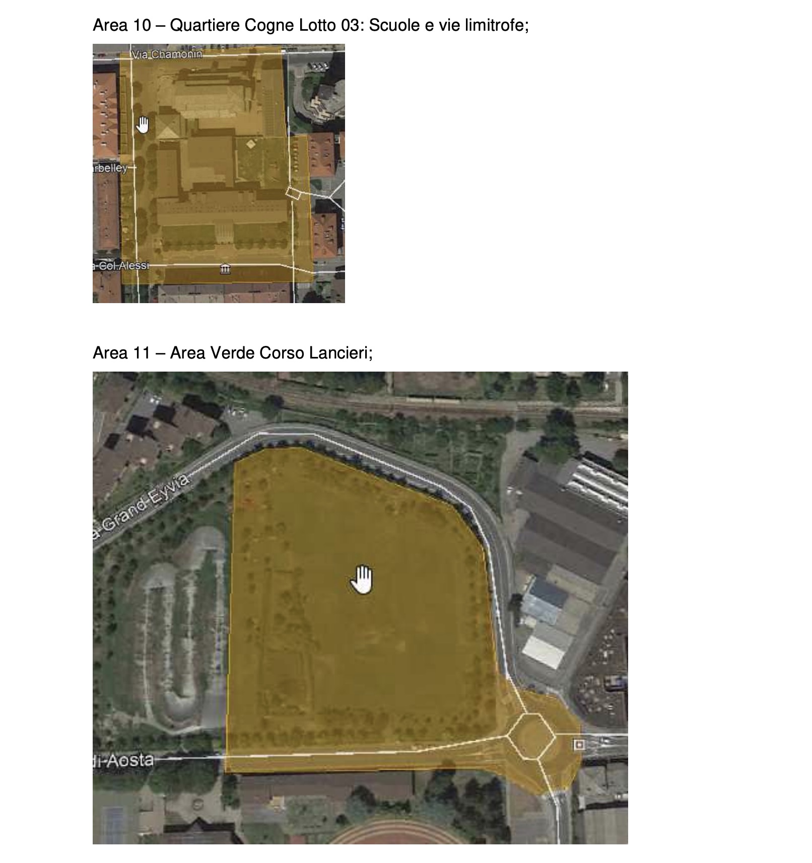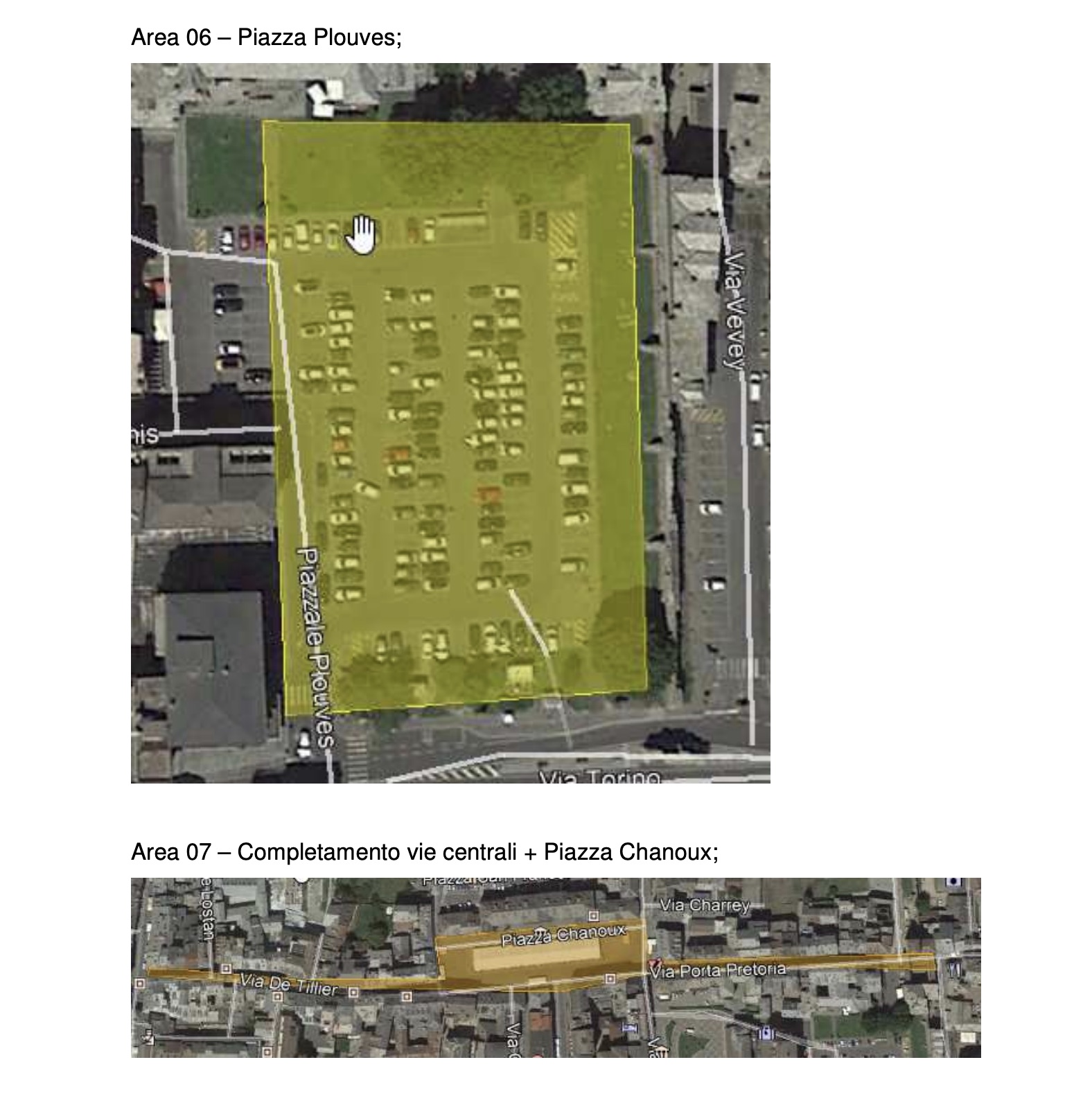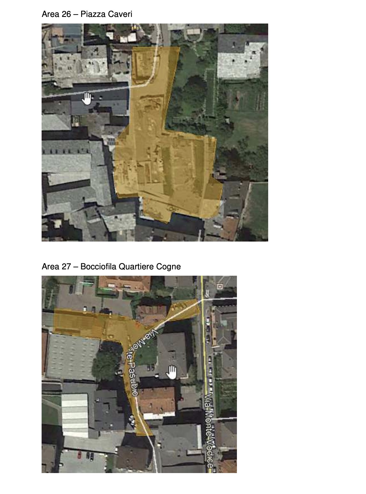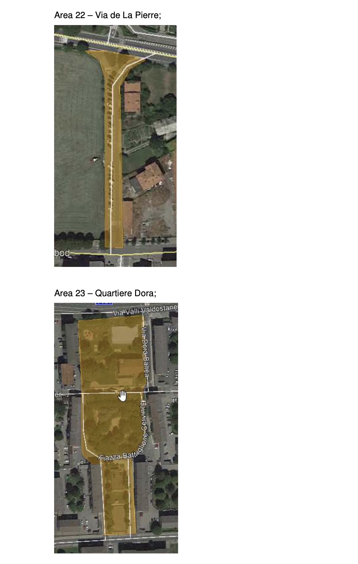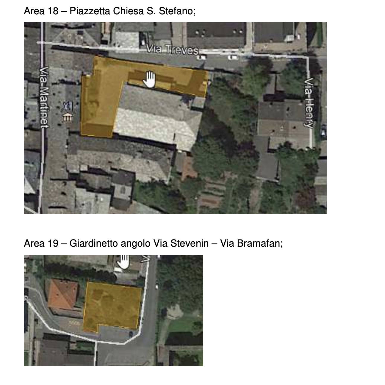 A queste si aggiungono anche piazza Roncas, il lotto 2 di quartiere Cogne (giardinetti e campo da basket), il lotto 3 della stessa zona (scuole e vie limitrofe), l’area verde di corso Lancieri ed il parcheggio di fronte al Palaindoor, quello dell’area sportiva Tsambarlet, l’autostazione di via Carrel, via Trottechien e passage du Verger, passage Folliez, il vicolo tra via Trèves e corso XXVI Febbraio, la piazzetta della chiesa di Santo Stefano, i giardini all’angolo tra via Stévenin e via Bramafam e quelli sulla stessa via, l’area verde del Ponte Romano, via de La Pierre, a quartiere Dora, in viale Europa/via Volontari del Sangue, al sottopasso Mattioda, in piazza Caveri e alla bocciofila del quartiere Cogne.