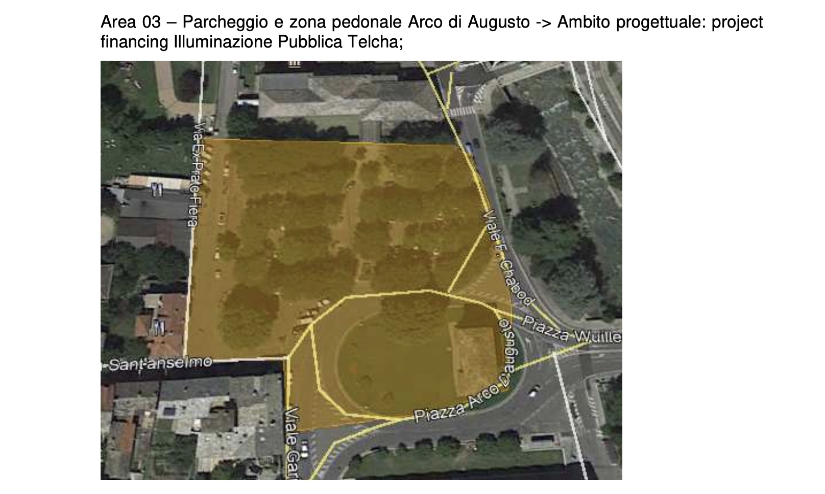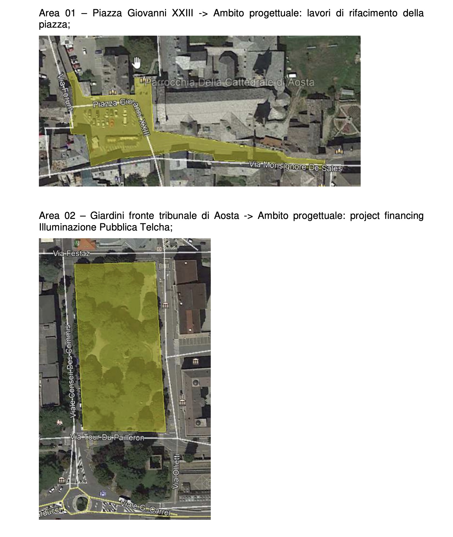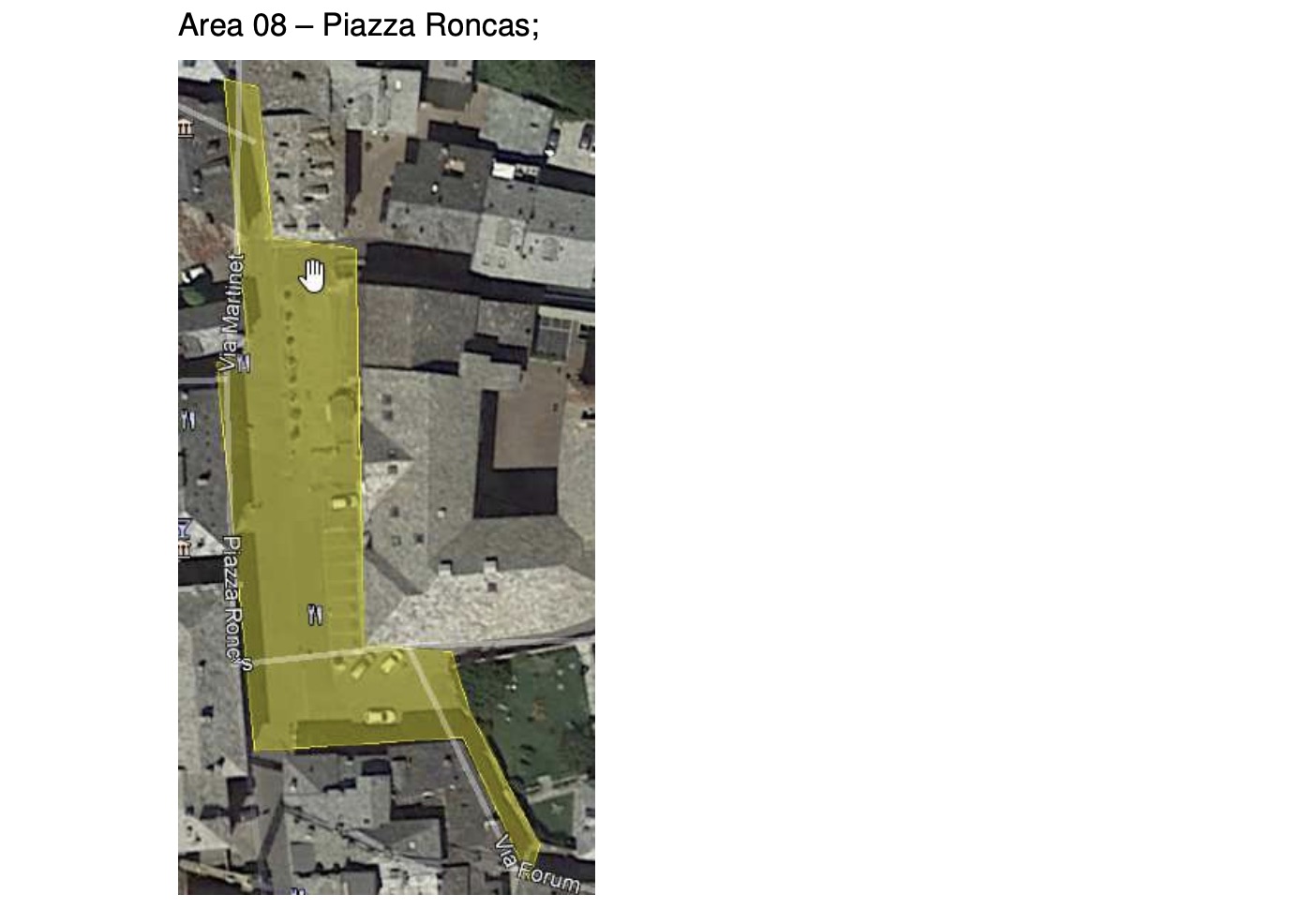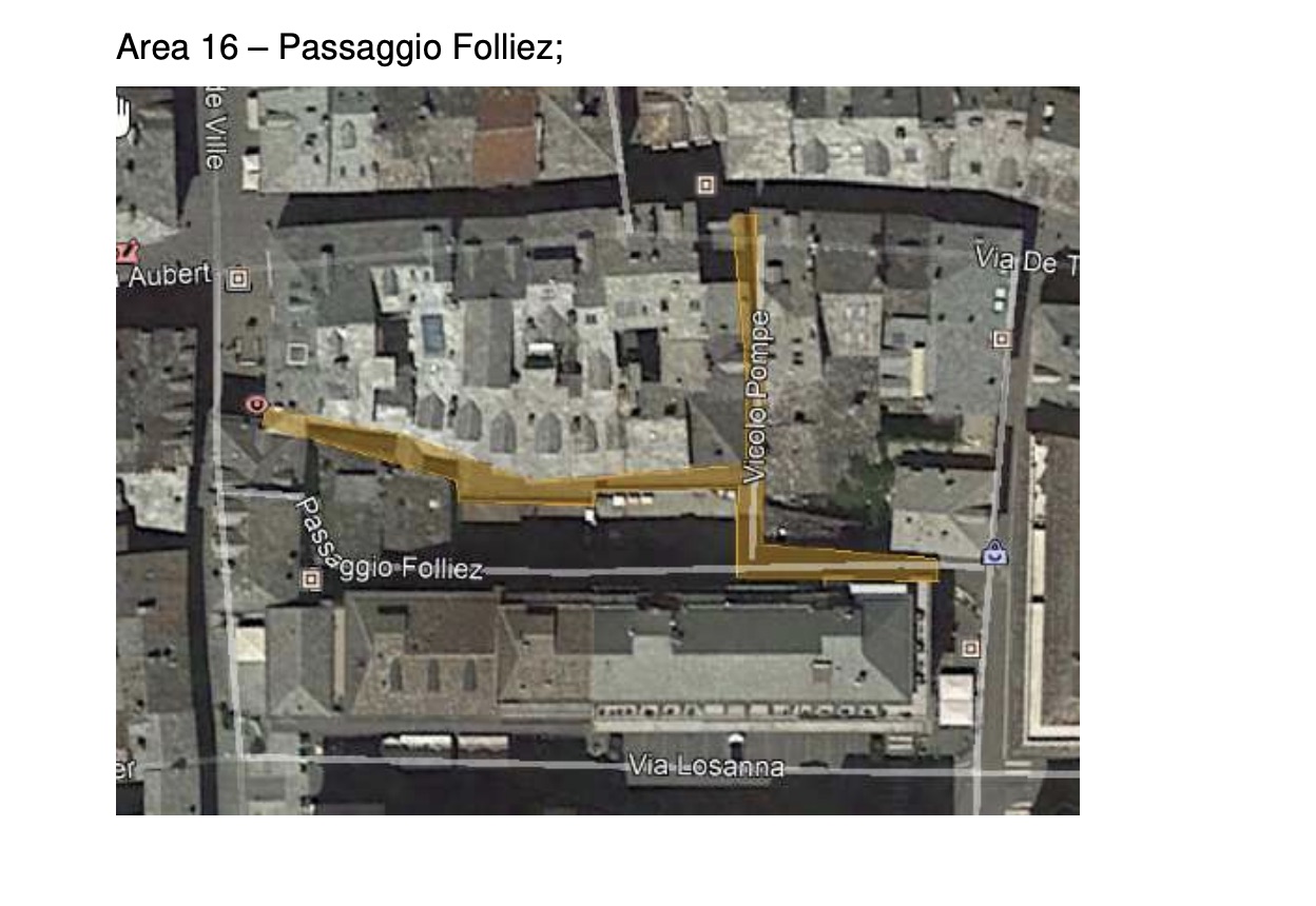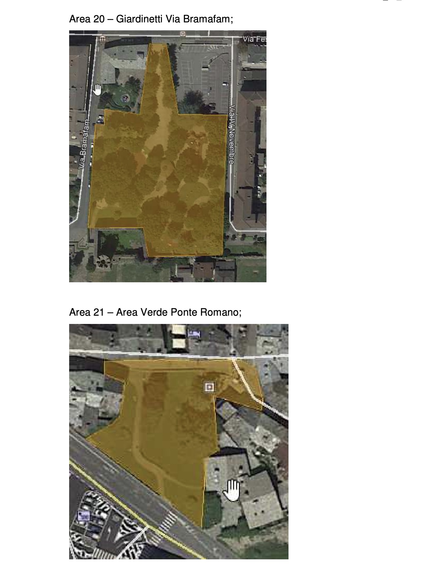A queste si aggiungono anche piazza Roncas, il lotto 2 di quartiere Cogne (giardinetti e campo da basket), il lotto 3 della stessa zona (scuole e vie limitrofe), l’area verde di corso Lancieri ed il parcheggio di fronte al Palaindoor, quello dell’area sportiva Tsambarlet, l’autostazione di via Carrel, via Trottechien e passage du Verger, passage Folliez, il vicolo tra via Trèves e corso XXVI Febbraio, la piazzetta della chiesa di Santo Stefano, i giardini all’angolo tra via Stévenin e via Bramafam e quelli sulla stessa via, l’area verde del Ponte Romano, via de La Pierre, a quartiere Dora, in viale Europa/via Volontari del Sangue, al sottopasso Mattioda, in piazza Caveri e alla bocciofila del quartiere Cogne.