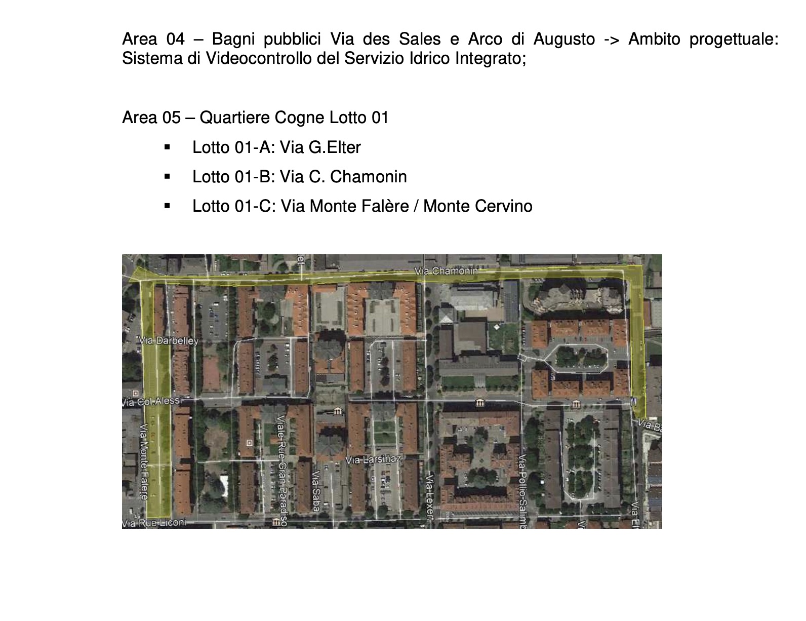 Nel dettaglio, lo studio formulato da In.Va prevede l’estensione della videosorveglianza a 27 nuove zone implementando il sistema da attuare in tre fasi annuali, con l’installazione delle telecamere in piazza Giovanni XXIII, ai giardini “Lussu”, al parcheggio, i bagni pubblici e la zona pedonale di piazza Arco di Augusto, i bagni pubblici di via des Sales, al lotto 1 di quartiere Cogne (cioè le vie Elter, Chamonin e Mont Fallère), in piazza Plouves, ma anche il completamento delle vie centrali e di piazza Chanoux.