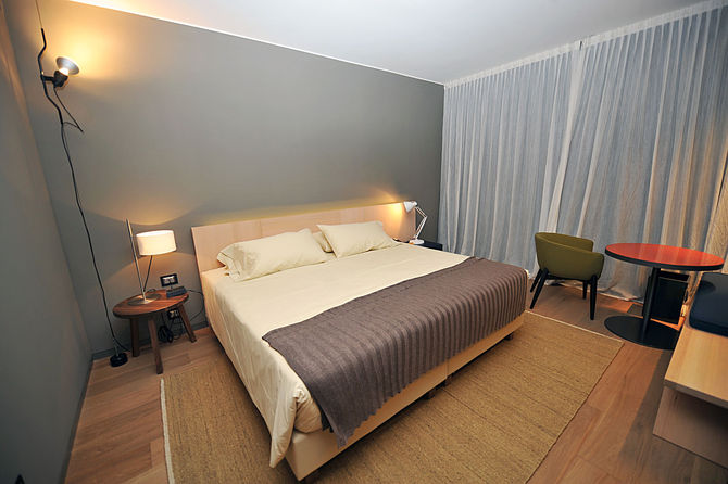 Il legno torna come costante anche nelle camere: nel parquet dei pavimenti, in rovere invecchiato a listoni, riscaldato da tappeti in lana; la testata del letto retro-illuminata è graficamente composta di doghe di legno; l’anta che nasconde il frigobar e la cassaforte è in larice naturale massello pantografato in rilievo, con grafie che riprendono le matrici storiche delle decorazioni valdostane.