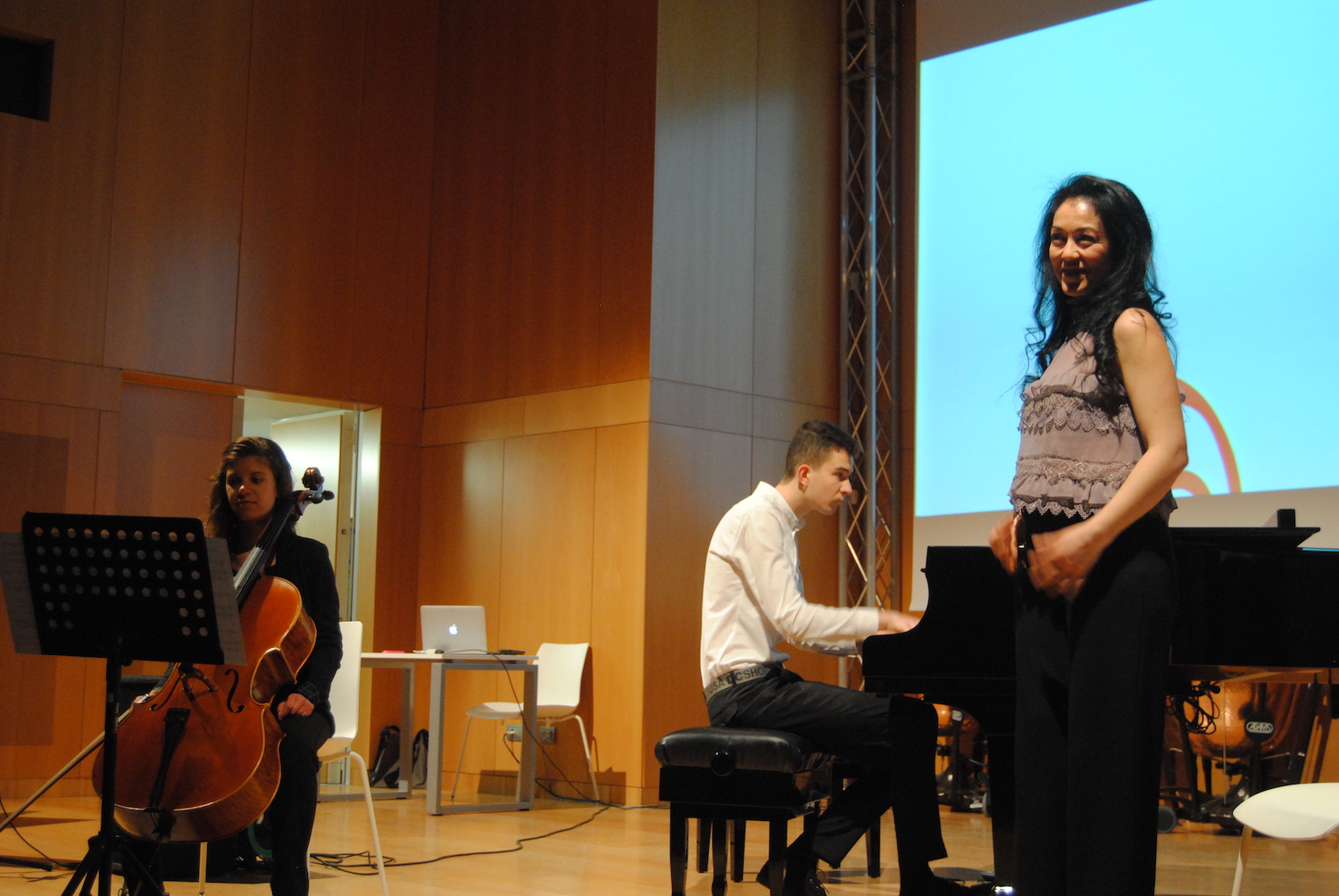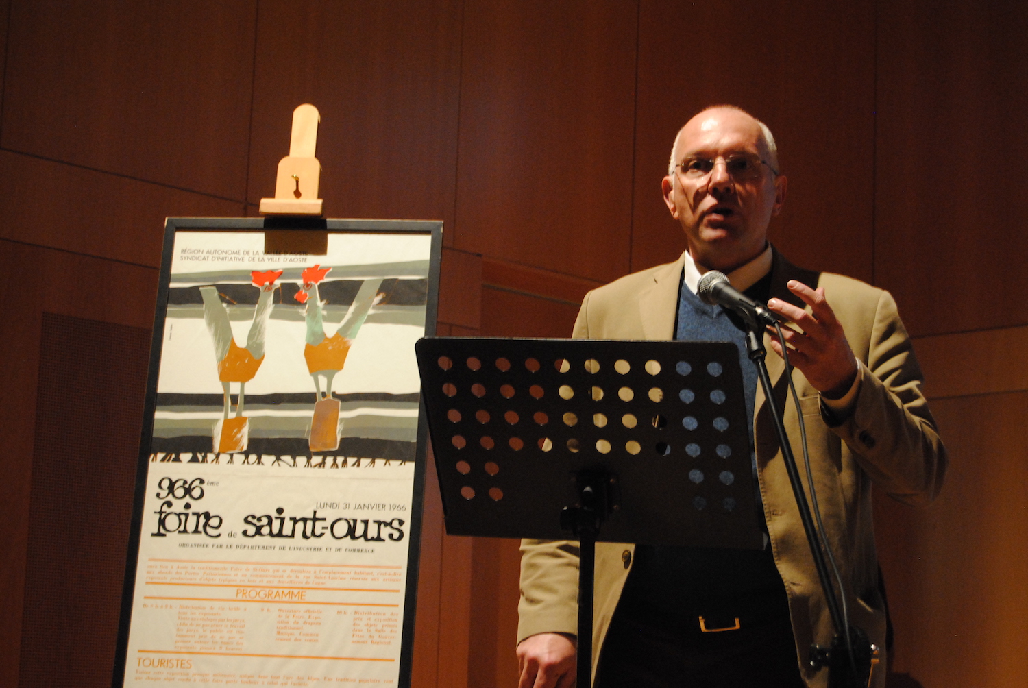 Di fronte al pubblico l’inizio di tutto, il primo manifesto della Fiera di Sant’Orso, del 1966, realizzato dal compianto Franco Balan. Dietro, proiettato, il nuovo “Anno Zero” per la “Millenaria”, il nuovo brand della Foire presentato oggi, mercoledì 10 aprile, all’Auditorium dell’Istituto musicale pareggiato, nella Torre dei Balivi di Aosta.