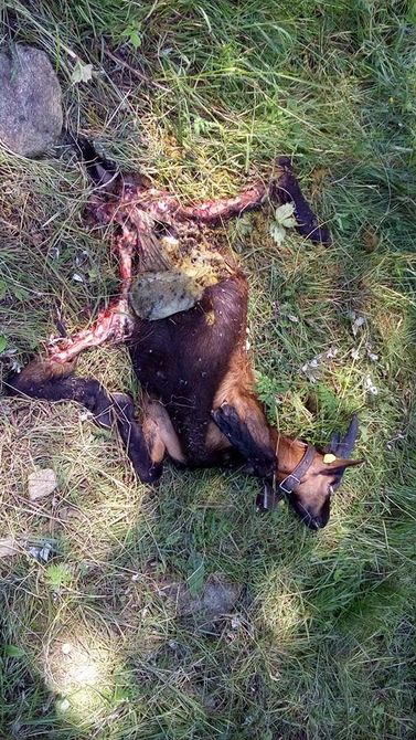 Questa mattina mi sono recato a controllare le mie capre in alpeggio nel comune di Perloz come faccio tutti i giorni. Le capre si trovavano all’interno di un recinto elettrificato, ma al mio arrivo quello che ho trovato è stato solo il corpo di una capretta (nata quest’inverno a febbraio) dilaniato e divorato per metà (come si vede dalle foto). Le altre capre, per fortuna, son riuscite a scappare e le ho ritrovate dopo ore di ricerca a ben 4/5 km di distanza visibilmente spaventate. Tra le sopravvissute due capre risultano ferite dall’attacco: una capra ha letteralmente un “buco” in pancia mentre l’altra (una capretta nata anche lei a febbraio) ha subito delle morsicature a livello dell’arto posteriore sinistro.
