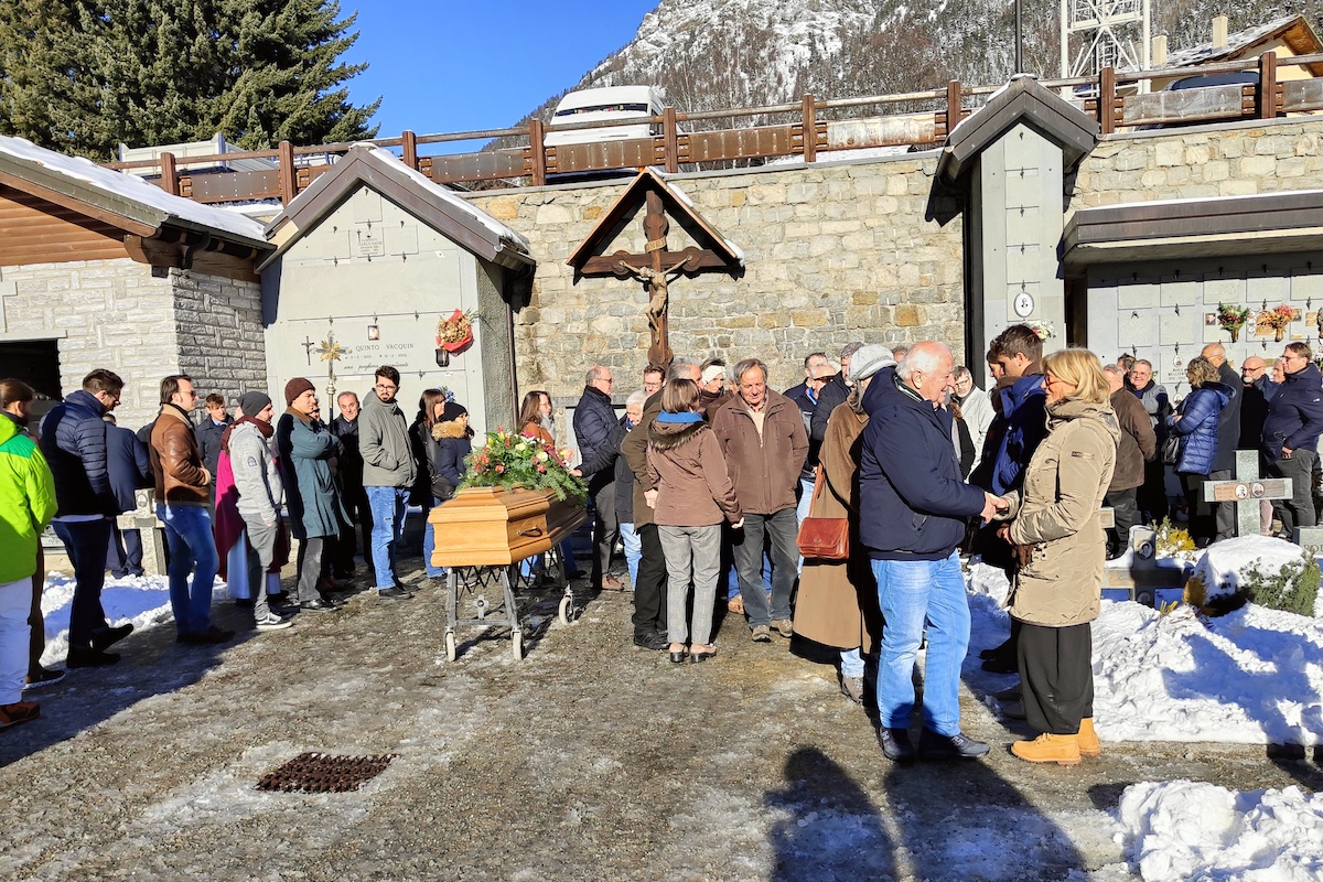 “In Occidente si è sempre messo l’accento sull’essere umano come un mortale e non come un natale – dice nell’omelia don Michele Giachino, parroco di Brusson, riprendendo le parole di Arendt -. Noi ci arrendiamo ad un aggettivo che sottrae vita, che tronca ogni possibilità. Eppure dentro di noi sentiamo che natale è un aggettivo che ha la forza di aggiungere vita”. E prosegue: “Vogliamo accompagnare Augusto andando ad attingere a quel principio di natalità che è scritto nel nostro Dna. Non tutto muore, rimane ciò in cui mettiamo il cuore”. Per questo, l’invito del sacerdote è di sostituire l’aggettivo mortale con l’aggettivo natale e aggiungerci il sostantivo destino: “Nel destino di natalità la visuale cambia radicalmente” e “il congedo si trasforma in un cancello che si spalanca sul sentiero luminoso che sale verso l’alto dove la vita non viene tolta ma moltiplicata”, conclude don Michele.