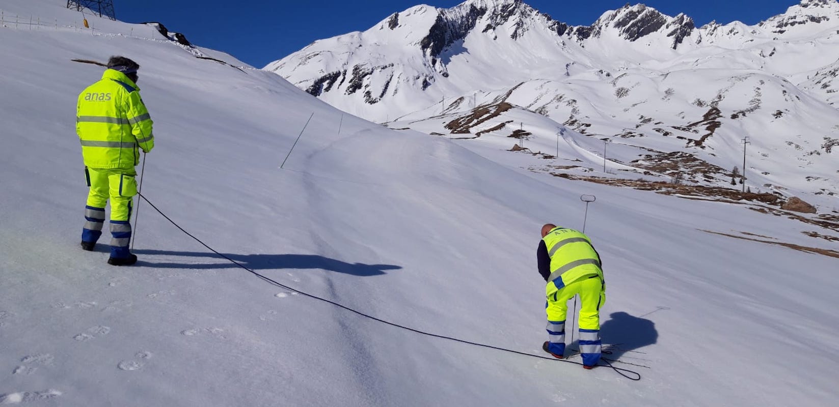 Nel corso dell’inverno le perturbazioni nevose hanno ricoperto la strada nascondendo il tracciato per lunghi tratti. Gli operatori Anas individuano la carreggiata con l’utilizzo di sonde e segnano il percorso per consentire alle frese di operare all’interno delle guide di riferimento.