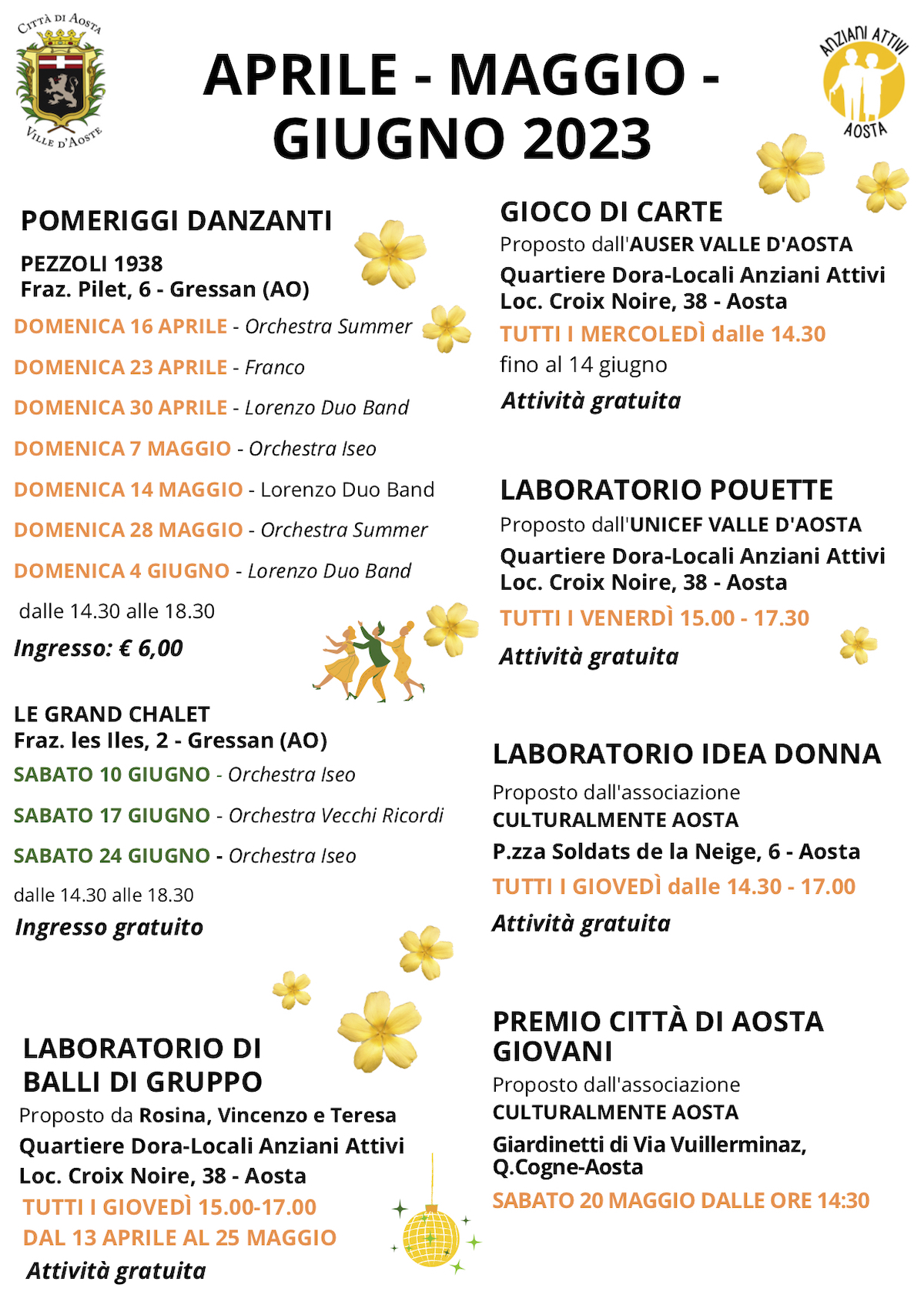 Questo il programma per i mesi di aprile, maggio e giugno 2023 inseriti nel programma “Anziani attivi”, organizzato dal Comune di Aosta in co-progettazione con il raggruppamento di cooperative sociali composto da La Sorgente e L’Esprit à l’envers.