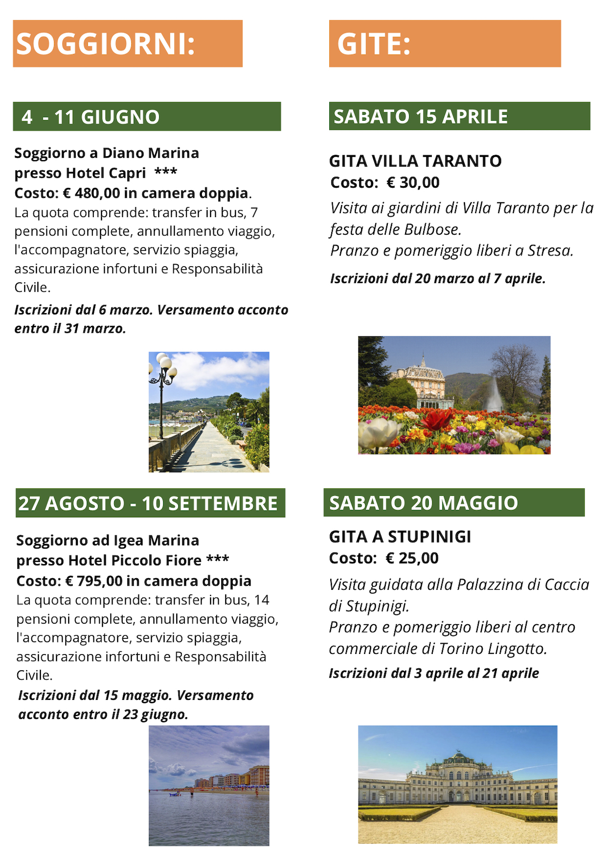 Pomeriggio danzanti, laboratori di balli di gruppo e di pouette, ma anche appuntamenti con il gioco delle carte, ginnastica in acqua, estiva al campo “Tesolin”, laboratori “Idea donna” e attività di prevenzione della salute e delle truffe. Oltre ai soggiorni – a Diano Marina e Igea Marina – e le gite a Villa Taranto e Stupinigi.