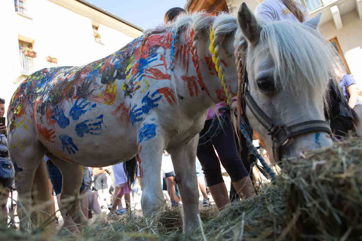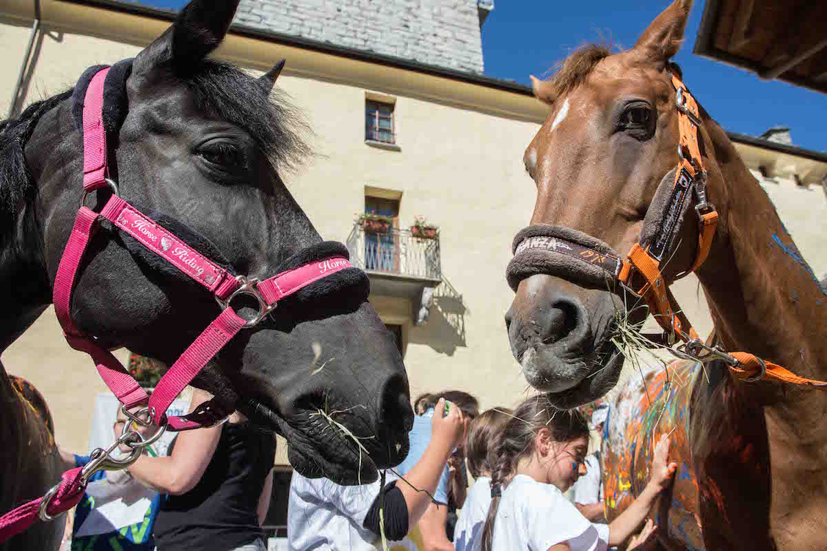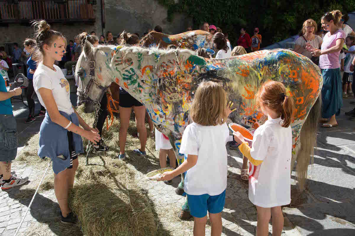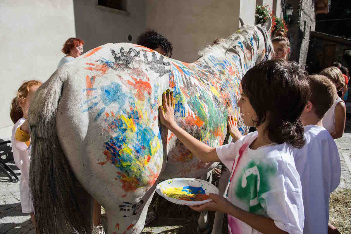 Singolare manifestazione del comune di Morgex e della ProLoco. Sabato scorso, 12 agosto, in piazza de l'Archet, i bambini, sotto il coordinamento artistico di Erika Centomo janno dipinto a mani nude i cavalli e pony messi a disposizione dall'A.S.D. Equi.libres du Mont Blanc, per fare “Pet Art Therapy”.
