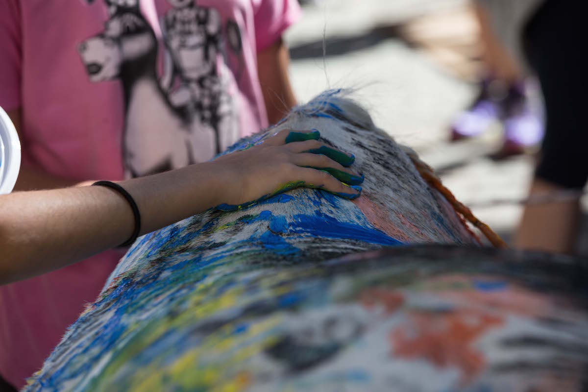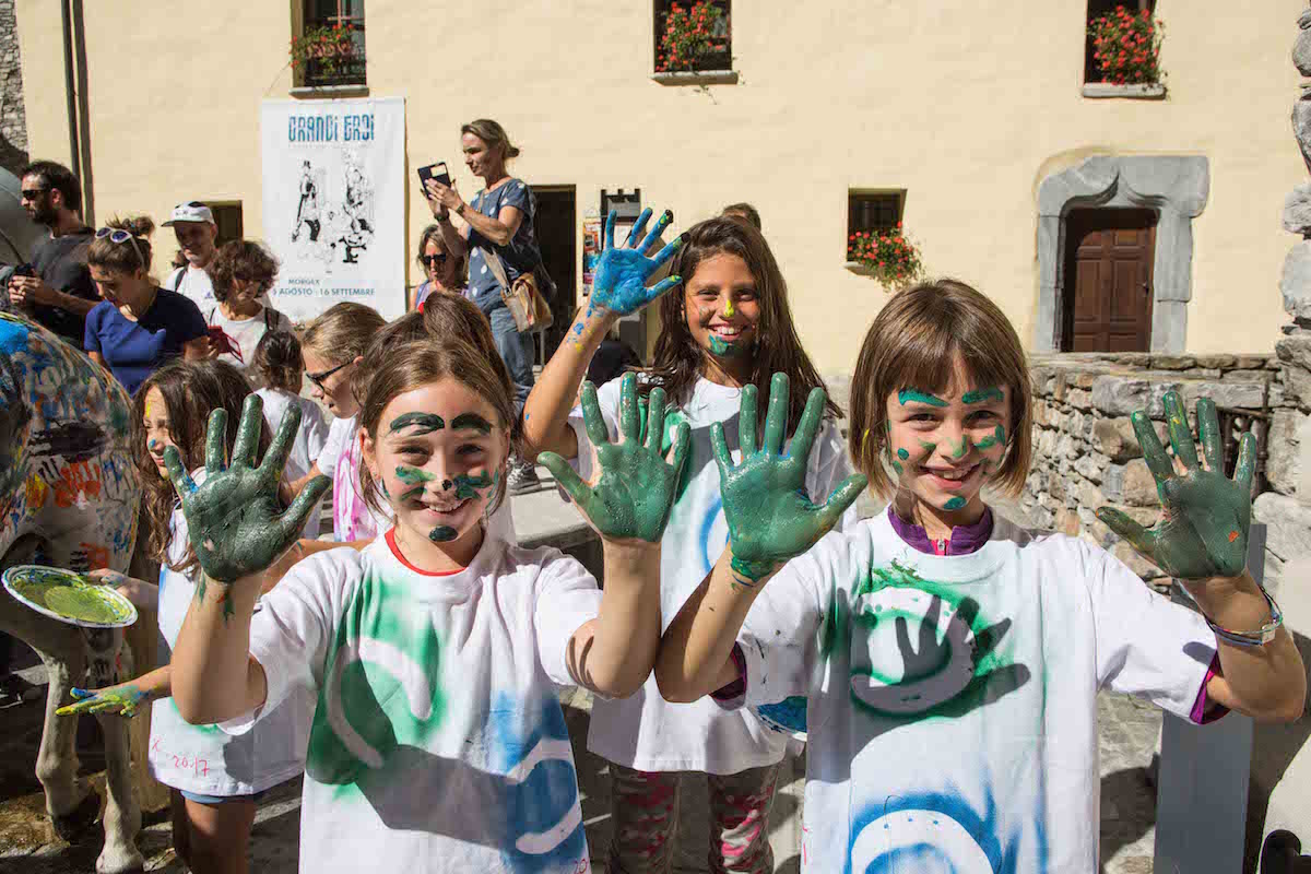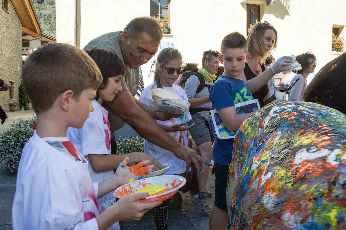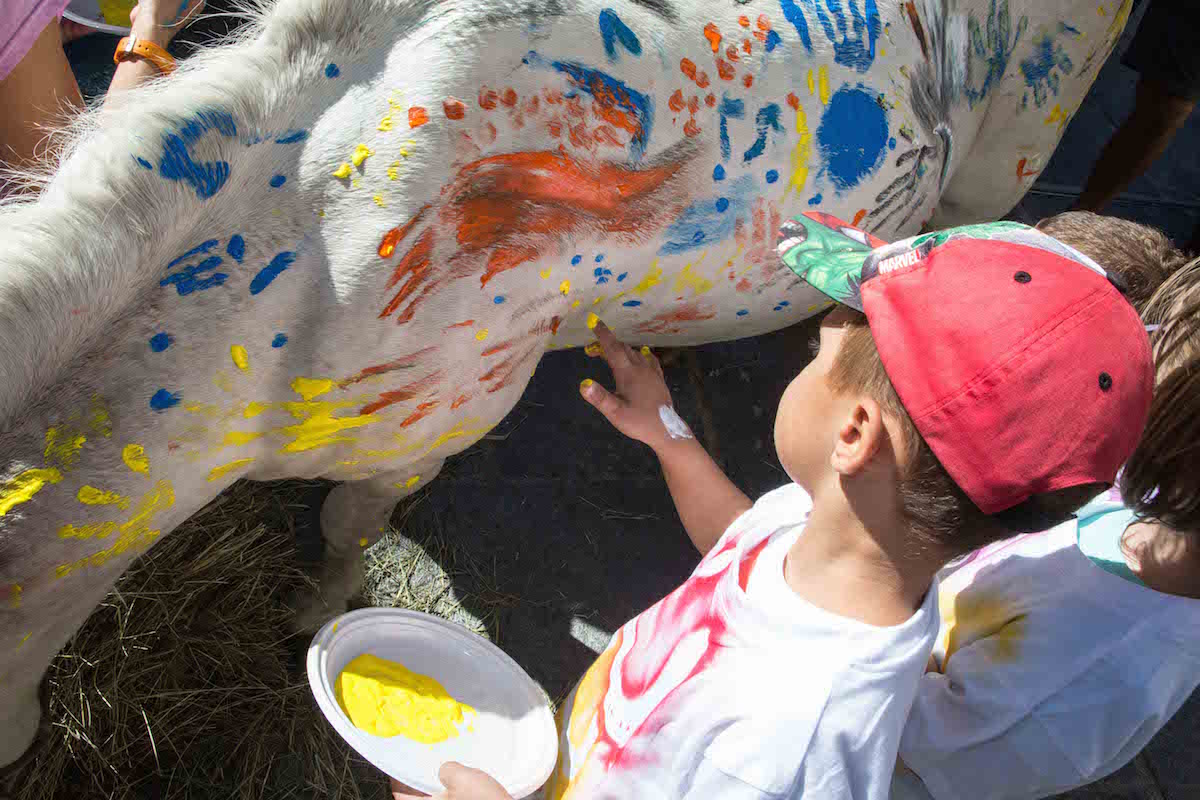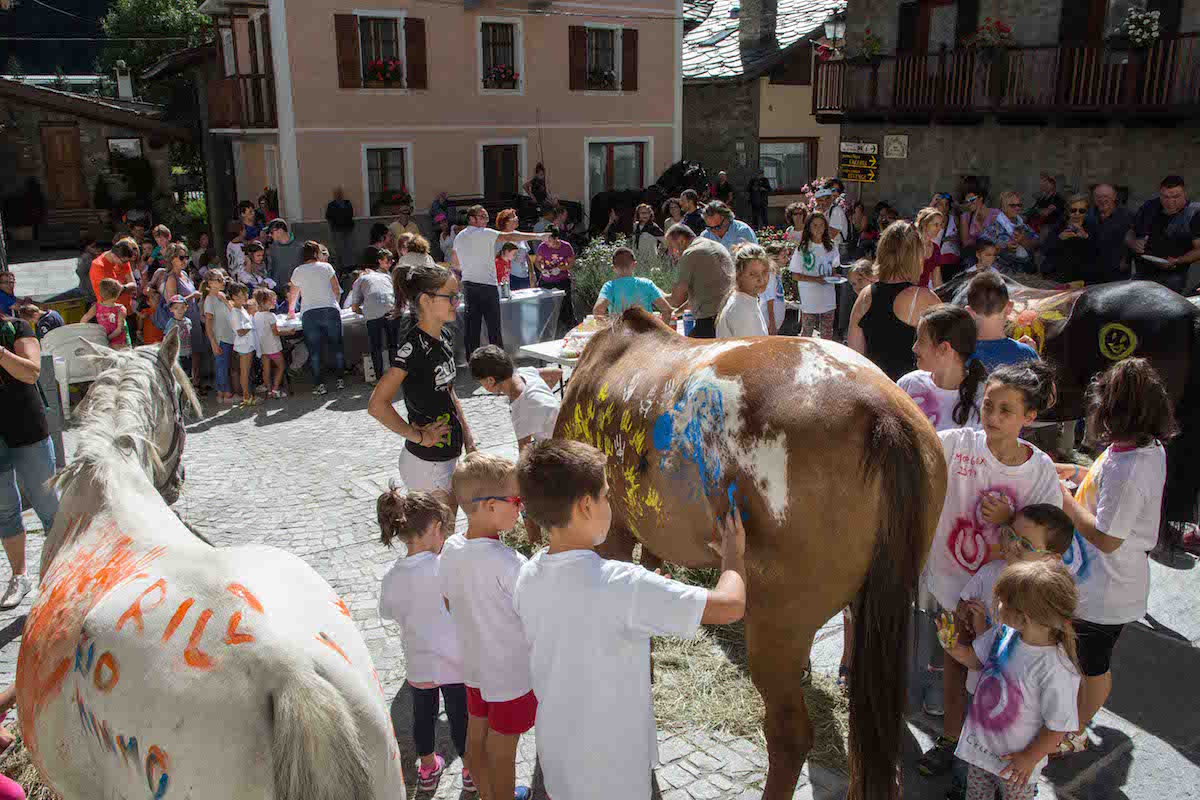 Singolare manifestazione del comune di Morgex e della ProLoco. Sabato scorso, 12 agosto, in piazza de l'Archet, i bambini, sotto il coordinamento artistico di Erika Centomo janno dipinto a mani nude i cavalli e pony messi a disposizione dall'A.S.D. Equi.libres du Mont Blanc, per fare “Pet Art Therapy”.