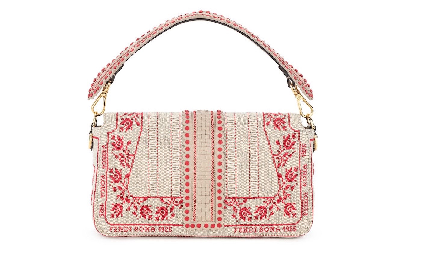 Tela di canapa tessuta a mano, ricamata con motivi di colore rosso e rifinita con dettagli à jour. Una combinazione di scritte, motivi geometrici e floreali. Così appare la rivisitazione valdostana dell’emblematica Baguette FENDI, borsa creata nel 1997 dalla direttrice artistica Silvia Venturini Fendi. A reinventare l’accessorio di moda, icona di Casa Fendi, la cooperativa Lou Dzeut di Champorcher.