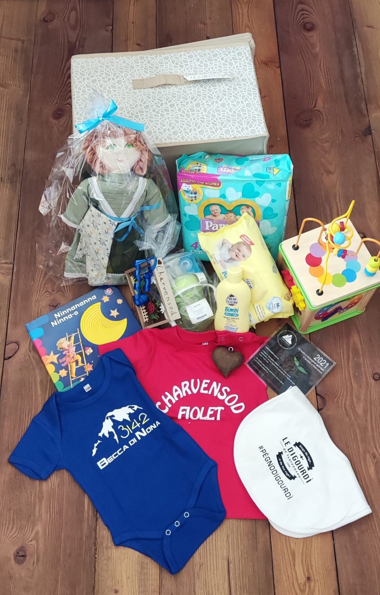 Al loro interno, tutto il paese ha fatto la sua parte: l’Amministrazione comunale di Charvensod ha inserito prodotti per l’igiene dei bimbi e un gioco, la Biblioteca ha offerto un libro, gli Alpini e la Pro Loco un bicchiere, l’associazione Sport de Noutra Tera una maglietta, l’associazione di promozione locale CharvensodExperience un buono da spendere nelle attività ricettive del territorio, l’Asd Charvensod un pallone, il gruppo teatrale Le Digourdì un bavagliolo, l’associazione di intaglio Pecca bouque un portachiavi di legno, l’Associazione Becca 3142 un body. Il box, inoltre, contiene anche una Puetta, che sostiene le attività dell’Unicef.