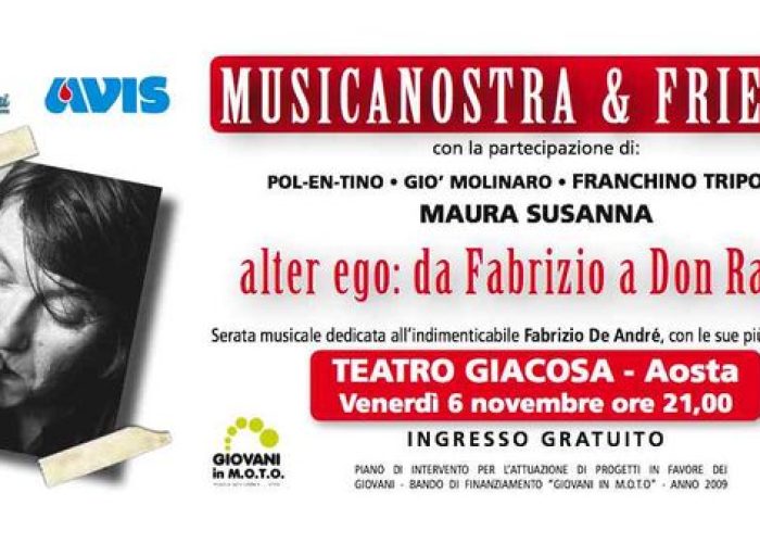 E' in programma sabato 6 novembre prossimo alle 21 presso teatro Giacosa di Aosta con ingresso libero un concerto dedicato a Fabrizio De André, il famoso cantautore genovese scomparso, ormai 10 anni fa,  all'età di 58 anni.