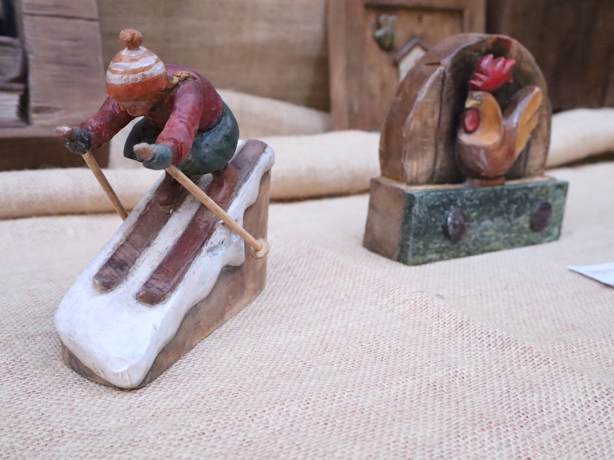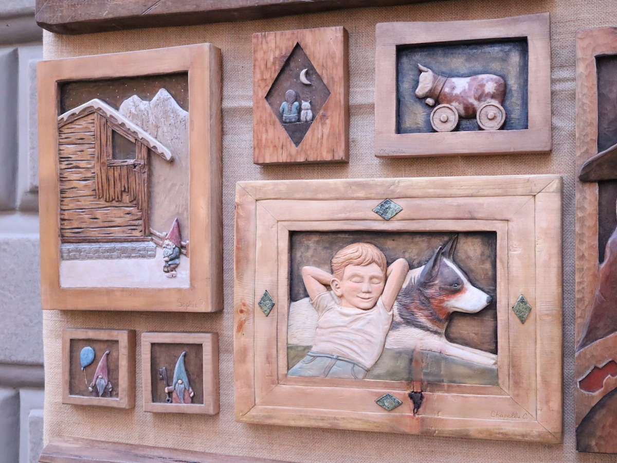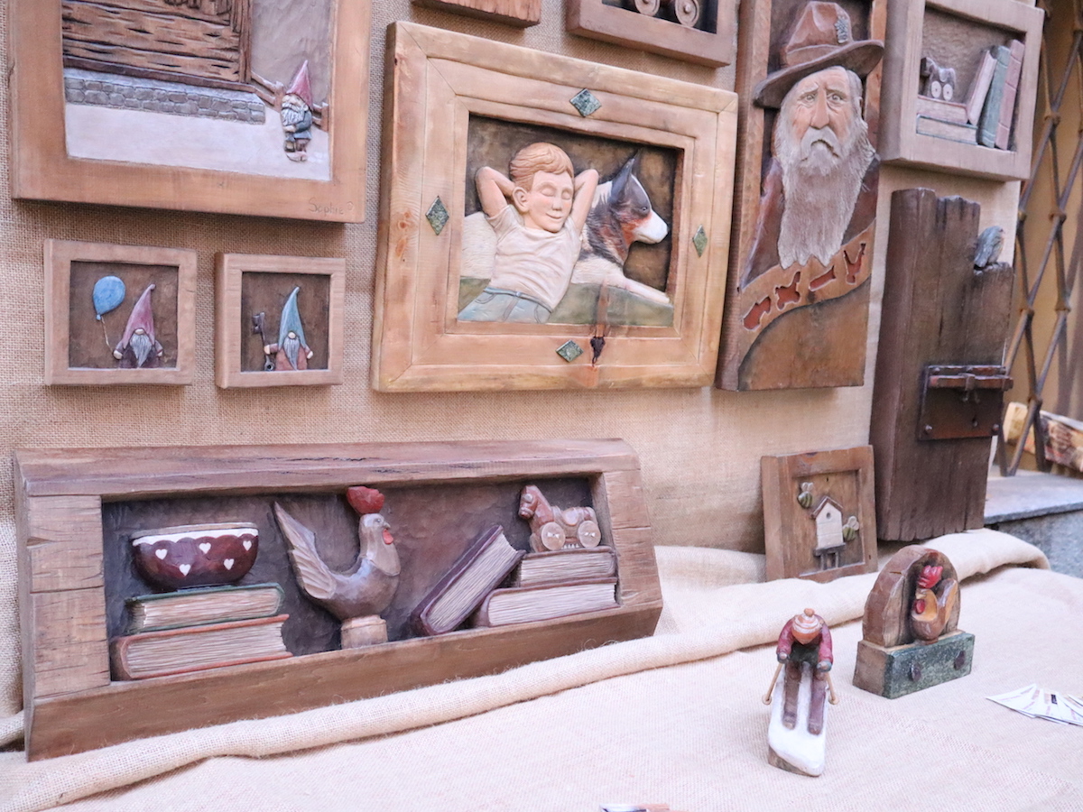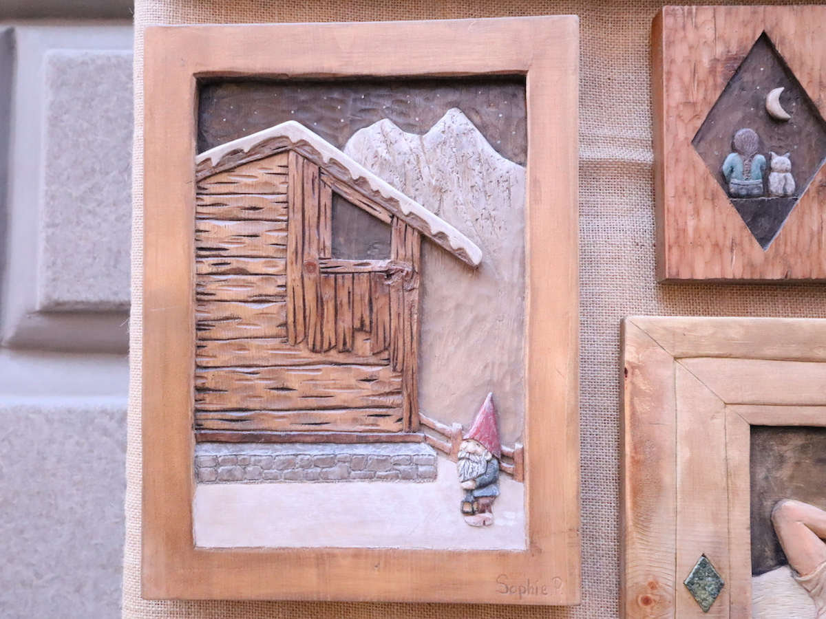 “Non ho uno stile definito: devo ancora tanto sperimentare. Mi piacerebbe trovare qualcosa che mi distingue” spiega Sophie Peraillon. Lei, al banco 99, come pezzo dell’anno presenta un bassorilievo che raffigura “una casa in legno con uno gnomo”. Uno gnomo che regge una lanterna per illuminare la via di accesso al rascard e ai piedi porta un paio di sabot. Quella piccola creatura è l’omaggio di un’allieva al suo maestro perché da sempre Luciano Regazzoni ama scolpire personaggi fantastici come gnomi e folletti. “L’ho finita quest’anno, ma non è un’opera nuova. L’ho cominciata il giorno dell’esame finale di bottega scuola” precisa la scultrice.