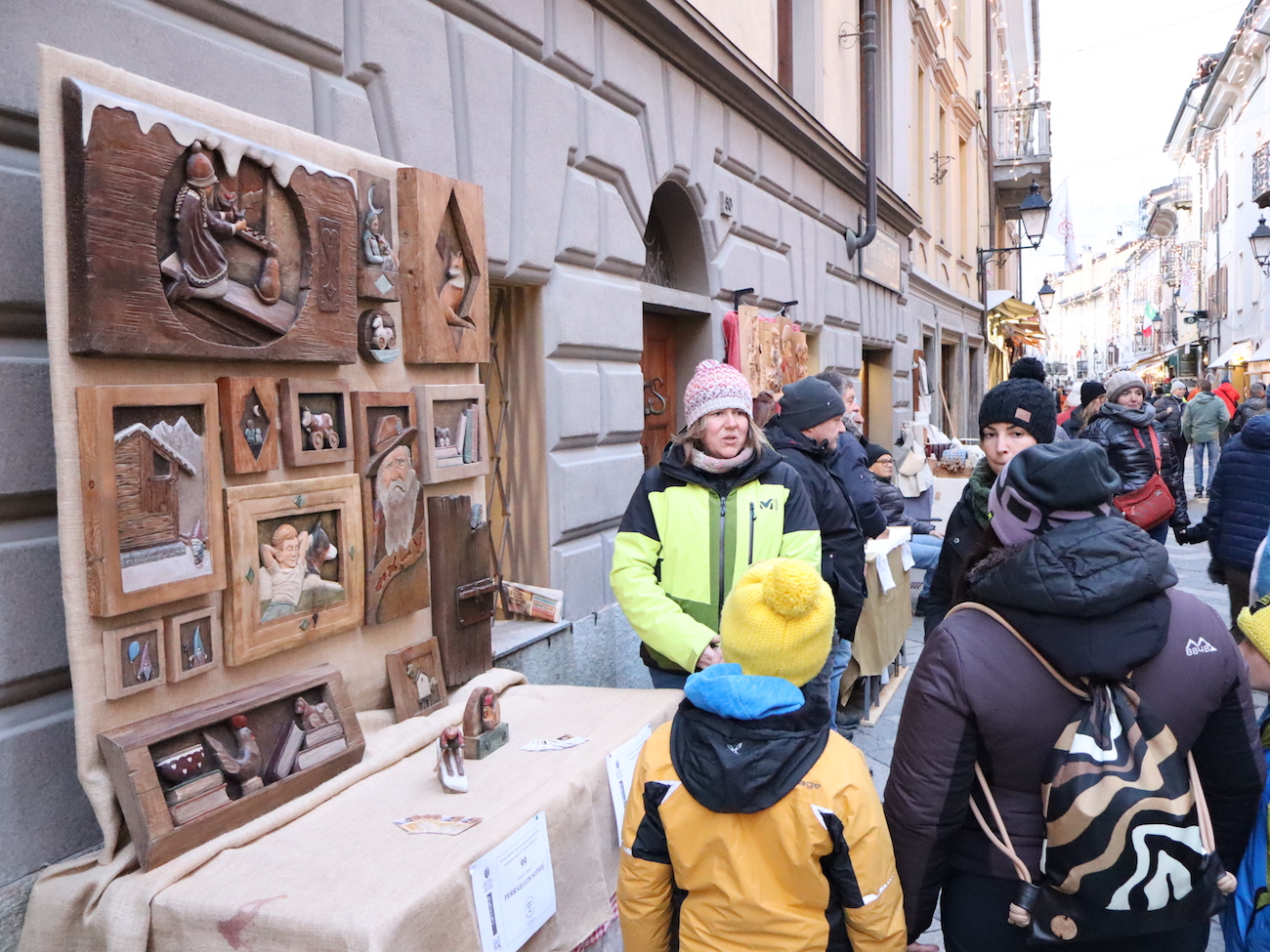 Al banco 99, in via Sant’Anselmo, Chantal Chapellu e Sophie Peraillon espongono i loro bassorilievi in legno. Da conoscenti a ‘compagne di bottega scuola’, nell’atelier di Fénis del maestro artigiano Luciano Regazzoni, e infine amiche, che, da ormai qualche anno, partecipano insieme alla Fiera di Sant’Orso, la Millenaria del 30 e 31 gennaio.