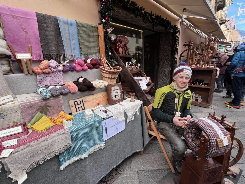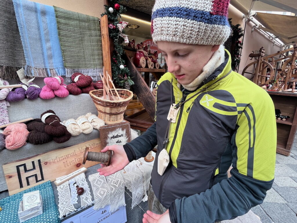 In fiera Davide porta soprattutto prodotti in lana, come lana filata a mano, lana tinta con piante e materiali naturali, sciarpe e tessuti d’arredo. Come passatempo ha imparato da solo anche a realizzare Les Dentelles di Cogne, i pizzi tipici della località del Gran Paradiso. “Una signora anziana mi ha dato due dritte sul dettaglio che distingue la lavorazione valdostana dalle altre”.