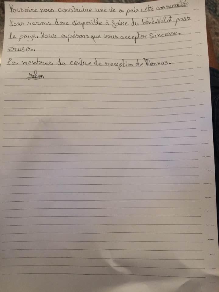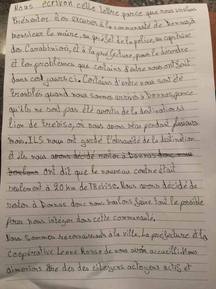 Il barometro torna a segnare bel tempo a Donnas. Dopo le proteste dei giorni scorsi, i migranti che hanno deciso di fermarsi in paese hanno chiesto e ottenuto di incontrare il sindaco, Amedeo Follioley, per consegnargli una lettera di scuse alla comunità, alle forze dell'ordine e al prefetto "per i problemi che alcuni di noi hanno creato in questi giorni".