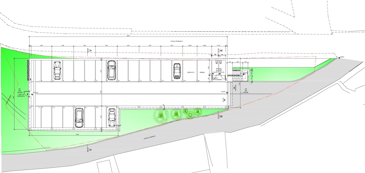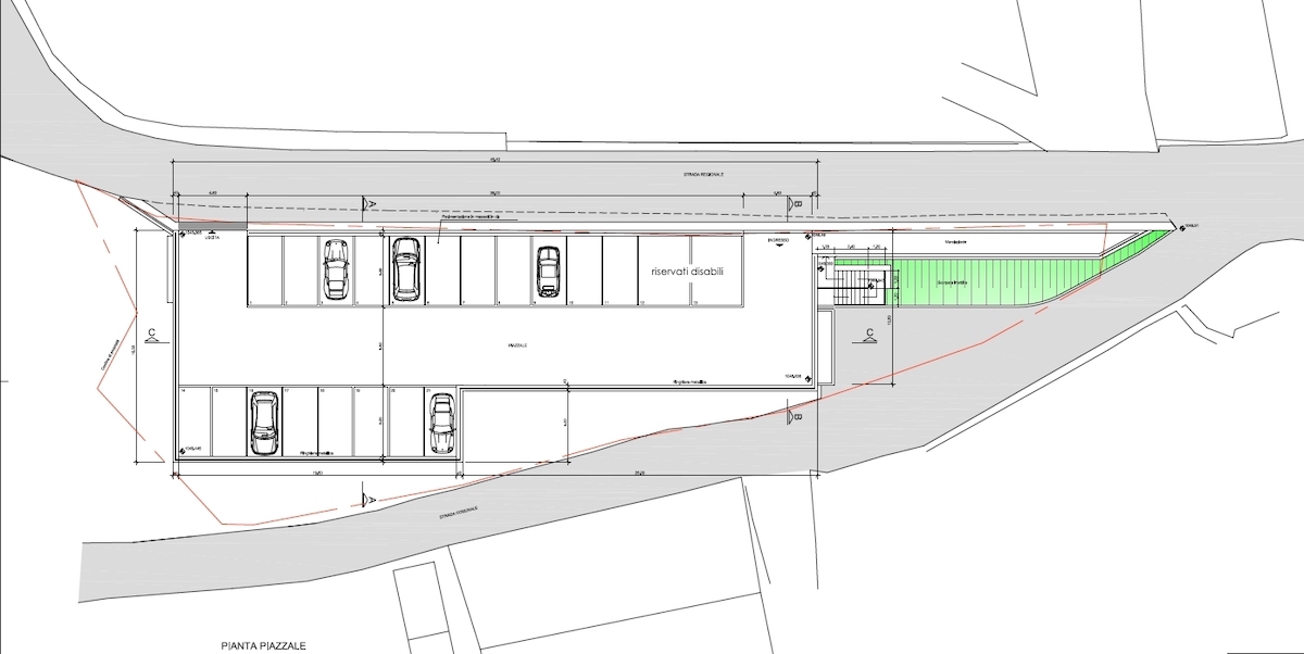 Il piano terra avrà 21 posti per autoveicoli su una superficie di circa 593 mq pavimentata con masselli in calcestruzzo a tre colori, in modo da segnalare le corsie e i posti macchina, con superficie trattata al quarzo a elevata resistenza all’abrasione. Il piano interrato, invece, avrà 24 posti auto su una superficie di circa 570 metri quadrati, e sarà accessibile attraverso una rampa larga 5,50 metri.