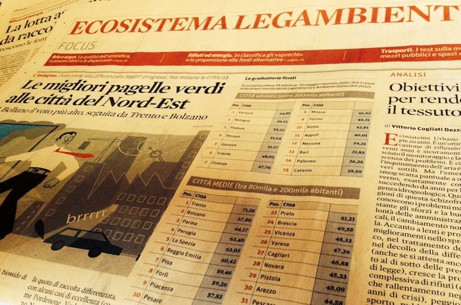 Le migliori 11 città del Paese raggiungono a malapena la sufficienza (con 60/100 di punteggio), quando soltanto rispettando i limiti di legge, senza nessuna performance straordinaria, il punteggio sarebbe molto vicino a 100. Tra le città con più di 200.000 abitanti è in testa Venezia, tra le medie vince di nuovo Trento che migliora la già buona media di concentrazioni di polveri sottili (25,5 microgrammi al metro cubo), la percentuale di acque potabili perse dalla rete idrica, (15%; contro il 37% di Aosta), migliora la percentuale di raccolta differenziata dei rifiuti: 65,6%. La seconda è Bolzano che ha la buona qualità dell’aria che ci si aspetta da una città di montagna (polveri sottili: 15 microgrammi al metro cubo).Tra le città piccole (al di sotto degli 80.000 abitanti) in testa è Belluno, con aria buona, un calo della produzione dei rifiuti a 395 chili all’anno per abitante e il 70,4% di raccolta differenziata, che toglie il primato a Verbania ora seconda, e terza Nuoro, una new entry.