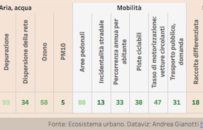 Brutte notizie continuano ad arrivare sul fronte della mobilità. Continua infatti a diminuire il rapporto fra passeggeri trasportati all'anno per abitante, dai 14 del 2015 ai 13,5 del 2016 (31esimo posto in classifica). Aumenta l'indice di ciclabilità: da 5,85 metri equivalenti ogni 100 abitanti a 7,2 del 2016. Migliora lievemente anche la superficie pedonalizzata, da 0,06 metri quadrati per abitante a 0,1. Diminuiscono anche i sinistri stradali ogni 1000 abitanti sono circa 3,84 le persone che hanno riportato lesioni nel 2016.