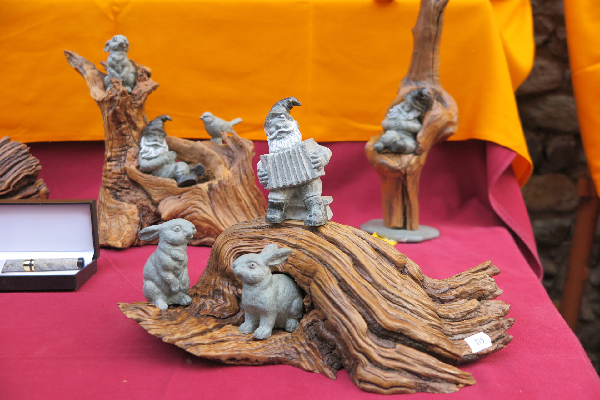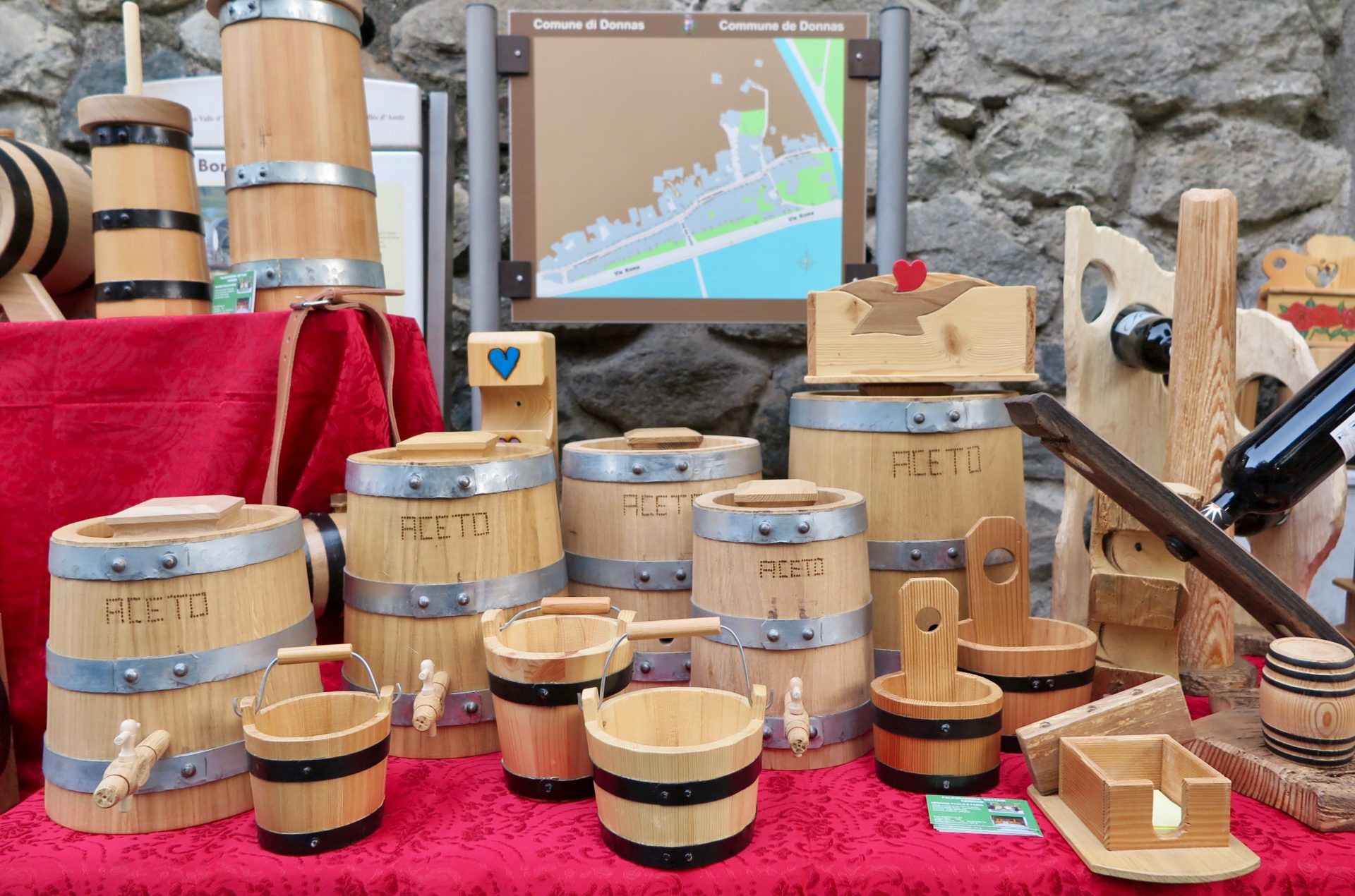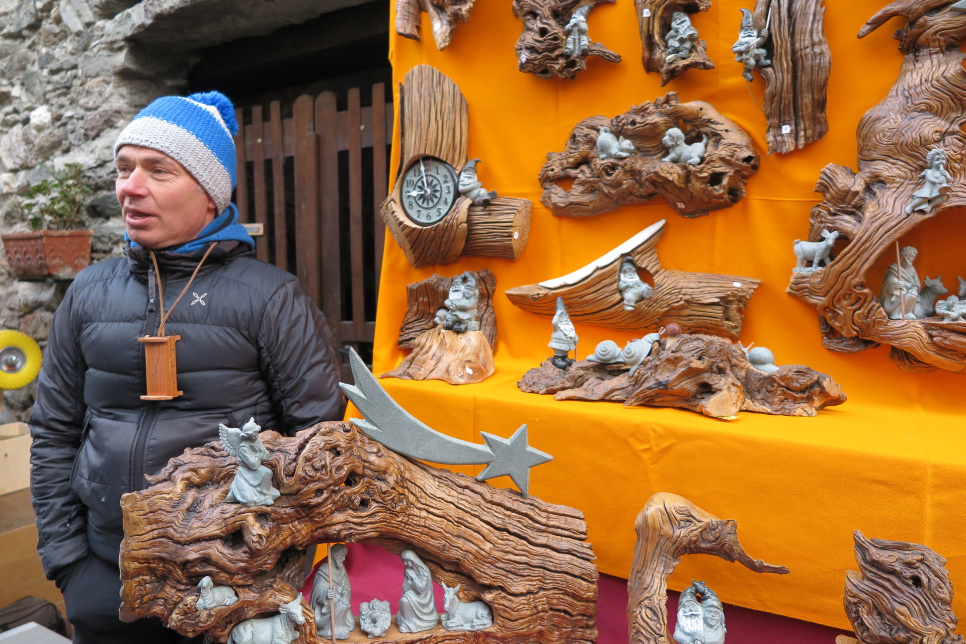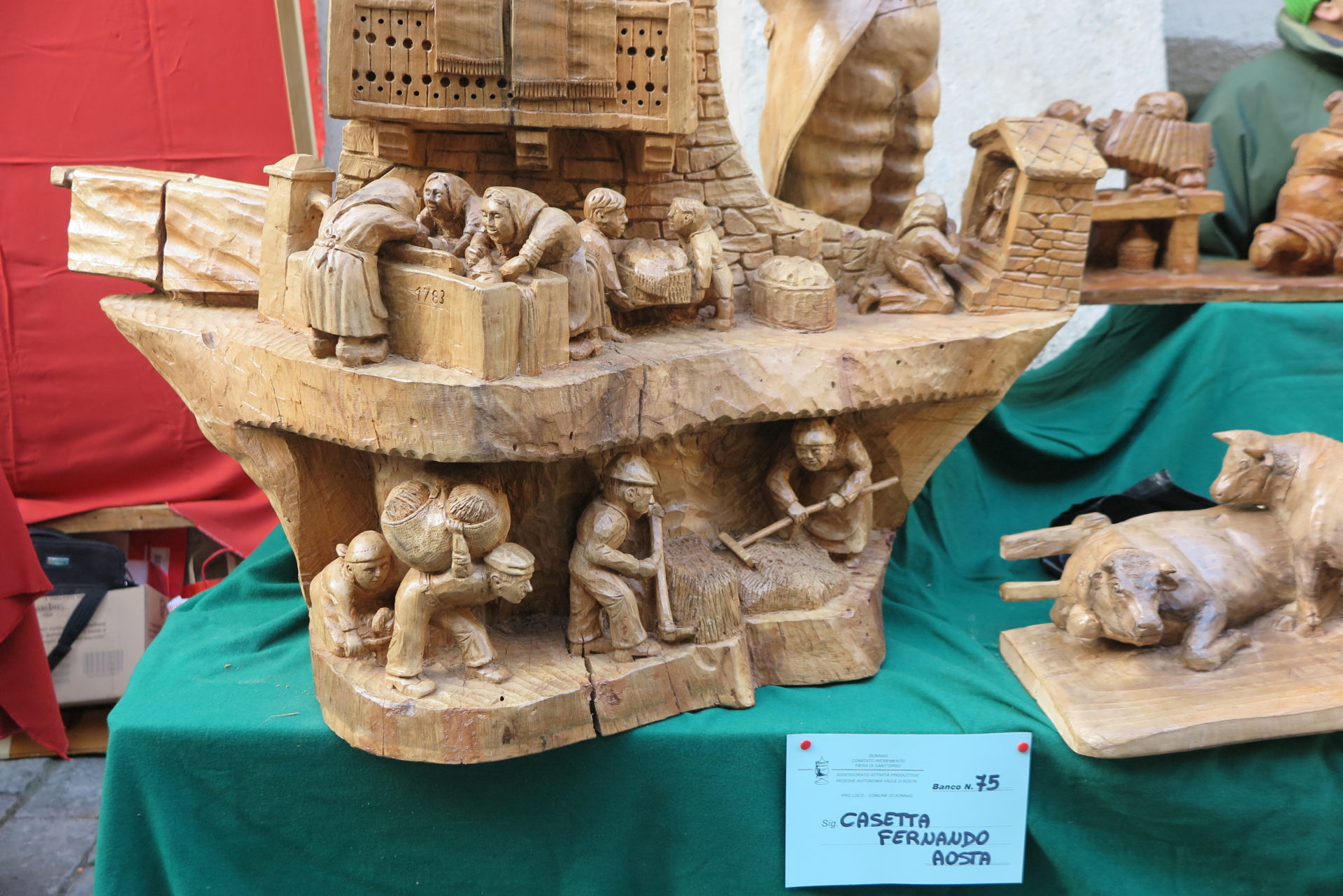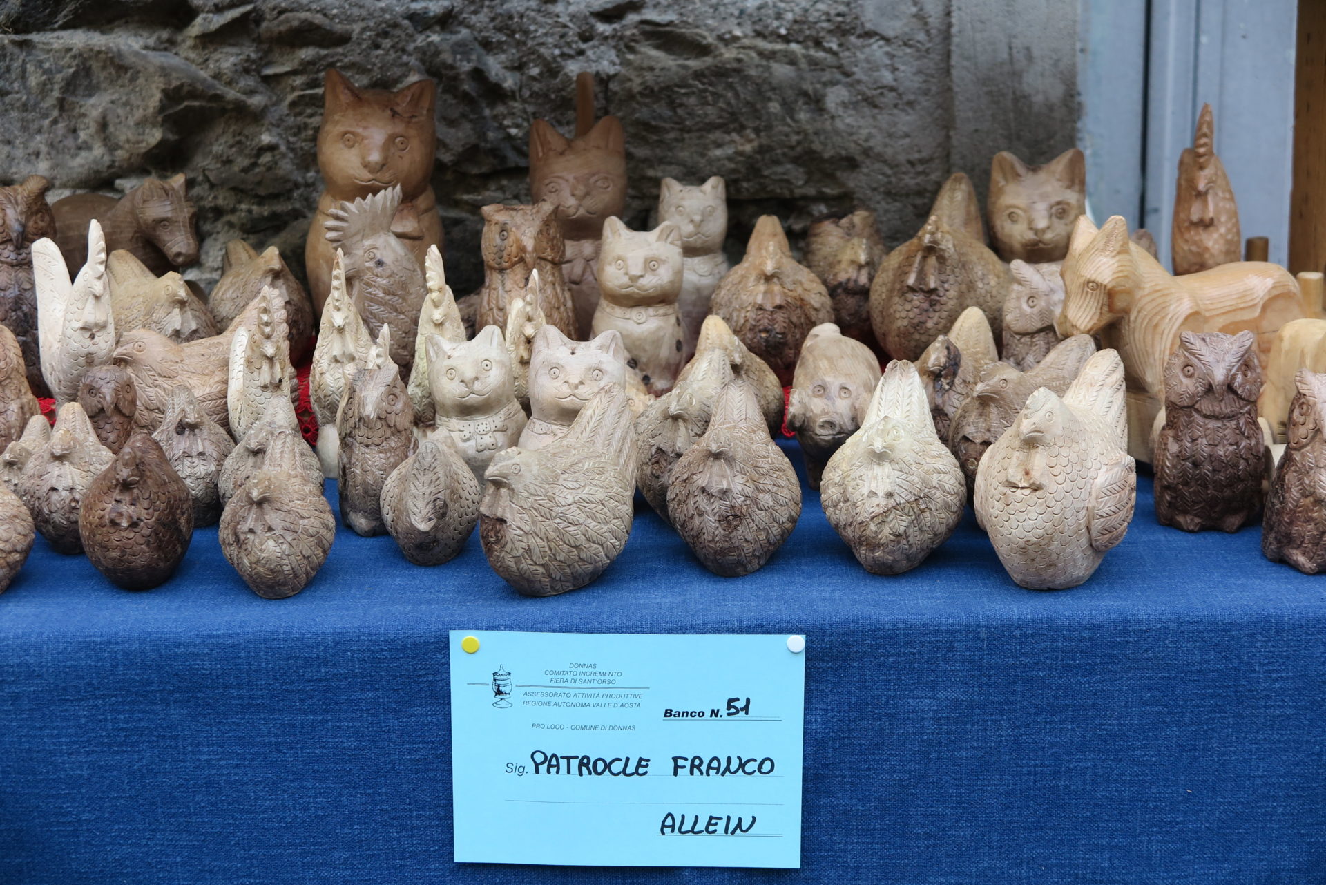 La Fiera di Donnas si conferma un appuntamento che richiama gli artigiani provenienti dalle Valli. C’è chi arriva da Doues, come Guido Diémoz che da otto anni consecutivi vince il premio della “sezione scultura”. Quest’anno presenta l’opera “Lo Secret”, realizzata in circa quattro mesi su legno di noce. Una donna intenta nella pratica giace in una stanza, mentre sulle scale esterne le persone attendono in coda il loro turno. C’è chi, come i fratelli Ferrari, ricerca nelle Valli di Champorcher e di Gressoney la pietra ollare da lavorare per poi affiancarla al legno di castagno.