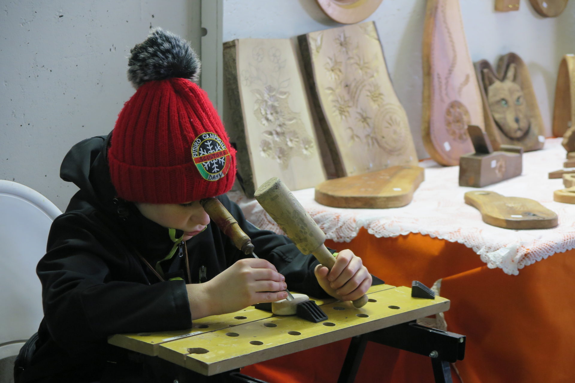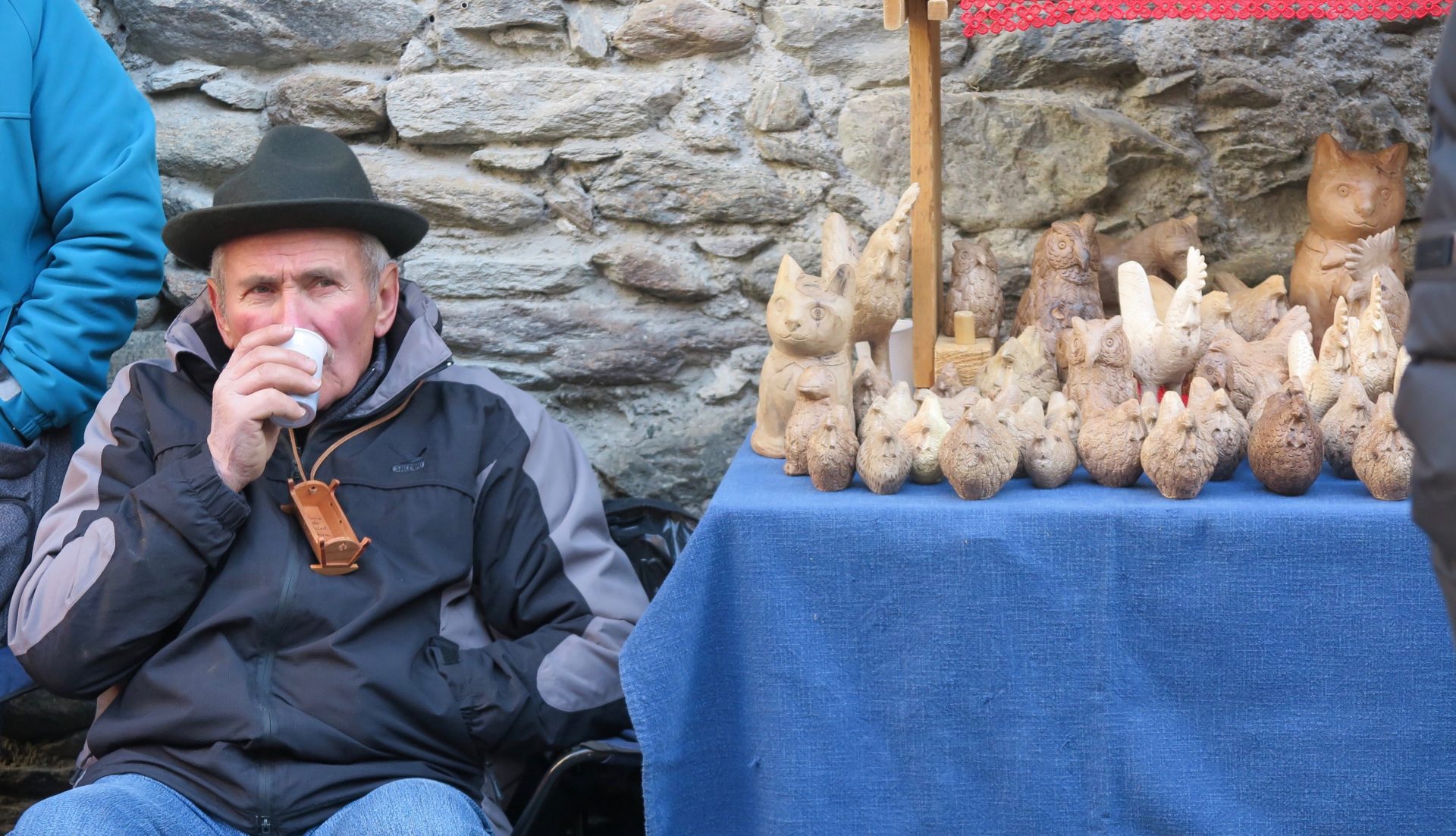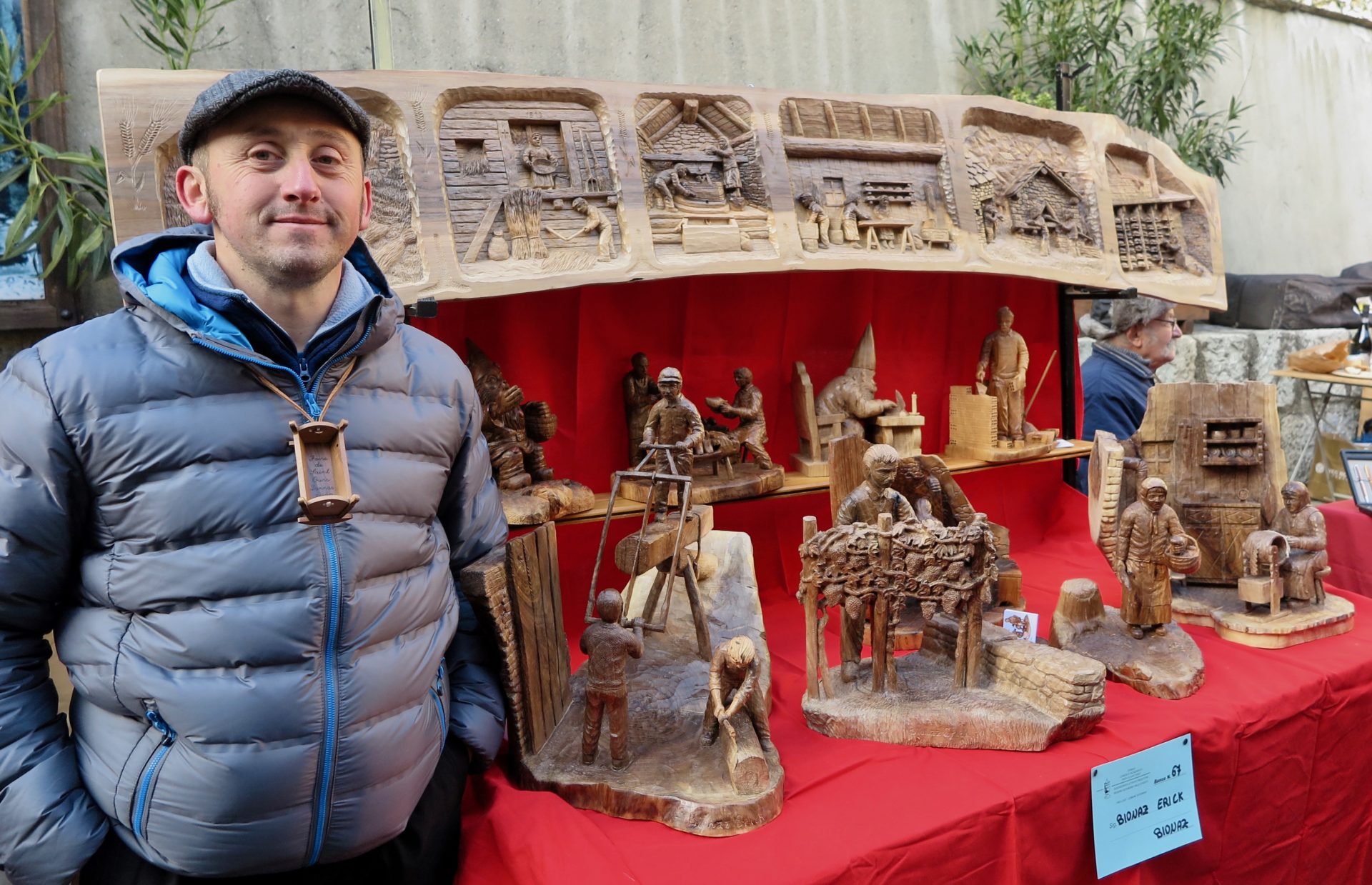 Un appuntamento da sempre legato alla tradizione non solo per i materiali utilizzati dagli artigiani, ma anche per le rappresentazioni create. Erick Bionaz, che dal 2005 partecipa alla Fiera, presenta su una tavola in legno di noce, un pezzo unico di due metri e quaranta, la trasformazione del pane nero. Dalla raccolta alla posa sulle rastrelliere in legno. Senza trascurare la macinazione al mulino, l’impasto e l’uscita del pane dal forno.