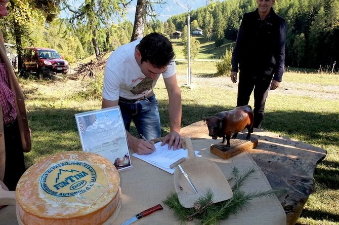 “Negli alpeggi valdostani viene coltivata una delle tradizioni più antiche del patrimonio culturale della nostra regione…. A quote, anche molto elevate, si trovano pascoli caratteristici delle zone alpine, con fiori ed erbe che rendono unici la fontina e il burro d’alpage. Una realtà e una dimensione d’altri tempi, con difficoltà e sacrifici da affrontare ogni giorno, ma che svaniscono di fronte alla passione degli arpian e alle soddisfazioni che solo questo mondo è in grado di regalare… anche a chi lo scopre per la prima volta, con una semplice visita ricca di emozioni”. In poche righe, sulla home page di un sito, si cela tutta la passione verso la montagna e verso il lavoro di allevatore di Sandro Bonin, giovane allevatore valdostano che insieme al fratello ha preso il testimone dal padre portando avanti un’azienda famigliare che fa binomio con qualità, tanto da vincere nel 2011 il concorso “Fontina d’Alpage”. E proprio in questa azienda, in particolare all’alpage La Premou in località Turlin di Aymavilles, è stata organizzata la conferenza stampa che lancia, dopo un anno di assenza, il concorso “Fontina d’Alpage” le cui iscrizioni sono aperte fino al 31 ottobre 2013.