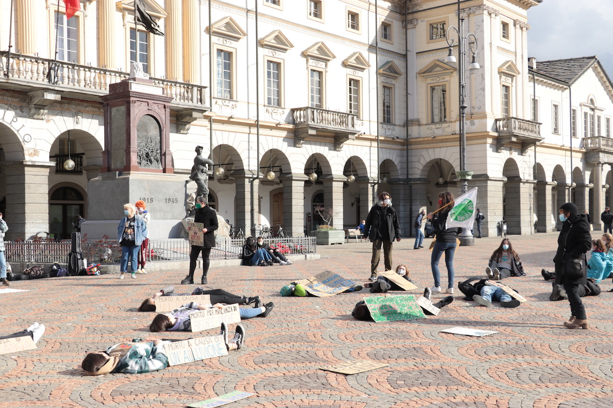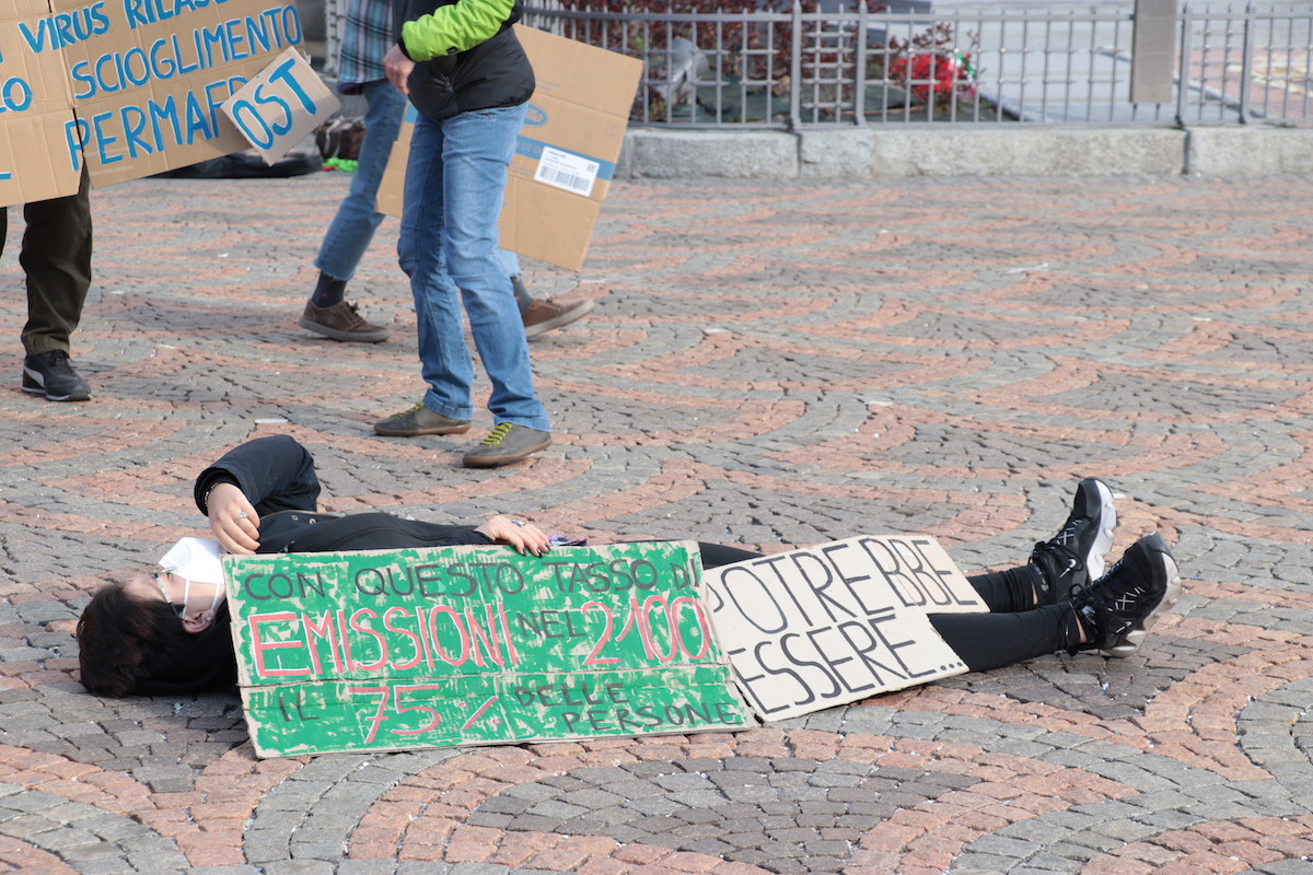A scandirlo, oggi in piazza Chanoux, sono stati i ragazzi di Fridays for Future, tornati a chiedere alla politica di invertire la rotta prima che sia troppo tardi. Per farlo, hanno scelto la forma del Die-in, una morte simulata, sdraiati a terra, lasciando ai cartelli la spiegazione della causa: “Morto a causa di un’alluvione”, “Morto a causa di una valanga”, “Morto per mancanza di risorse idriche”, “Morto a causa di un incendio”.