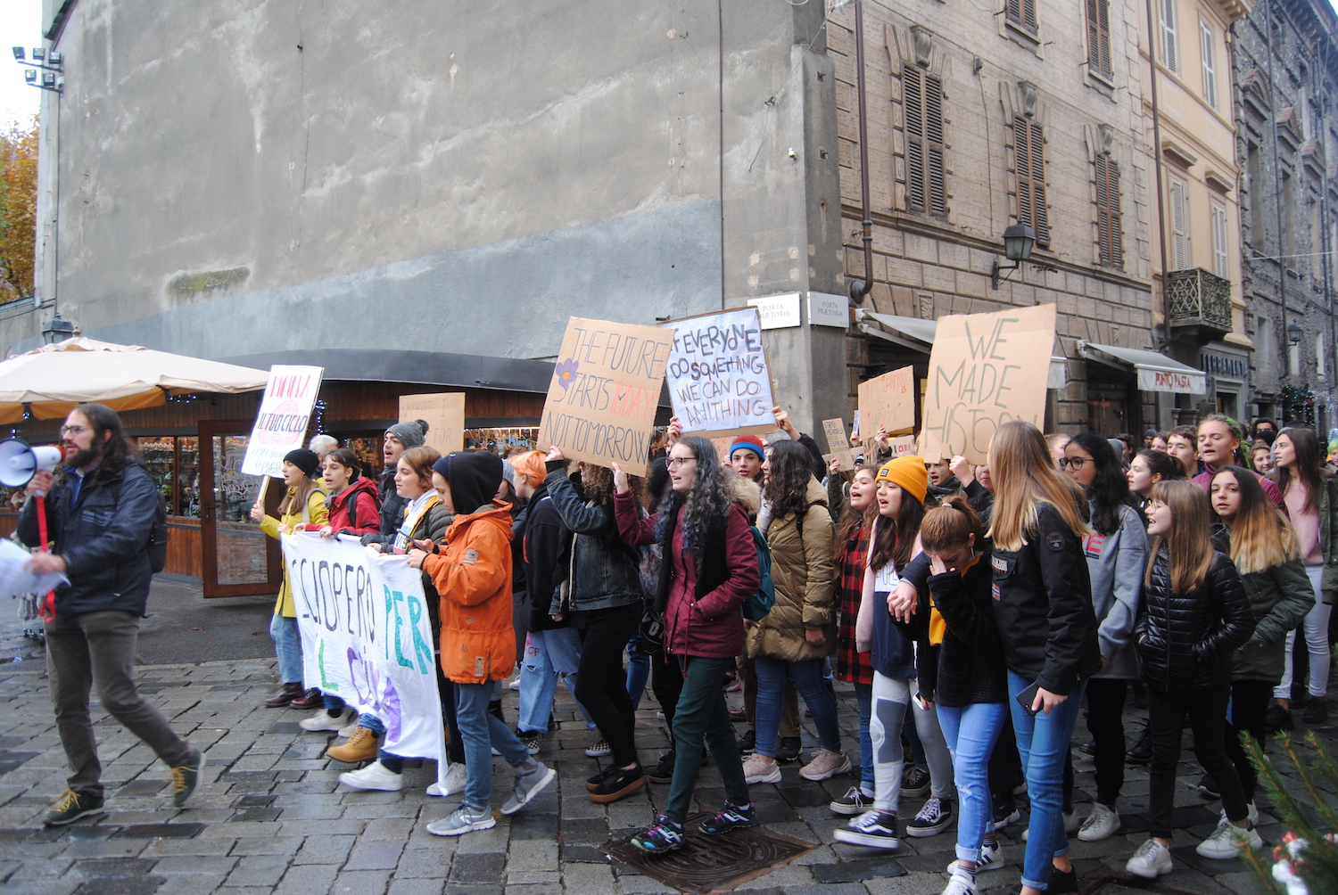 Sono meno rispetto alle altre occasioni, ma il tempo uggioso non ferma gli studenti di #FridaysForFuture, la protesta per chiedere nuove politiche ambientali – per evitare il disastro dei cambiamenti climatici – partita anche ad Aosta dallo scorso marzo.