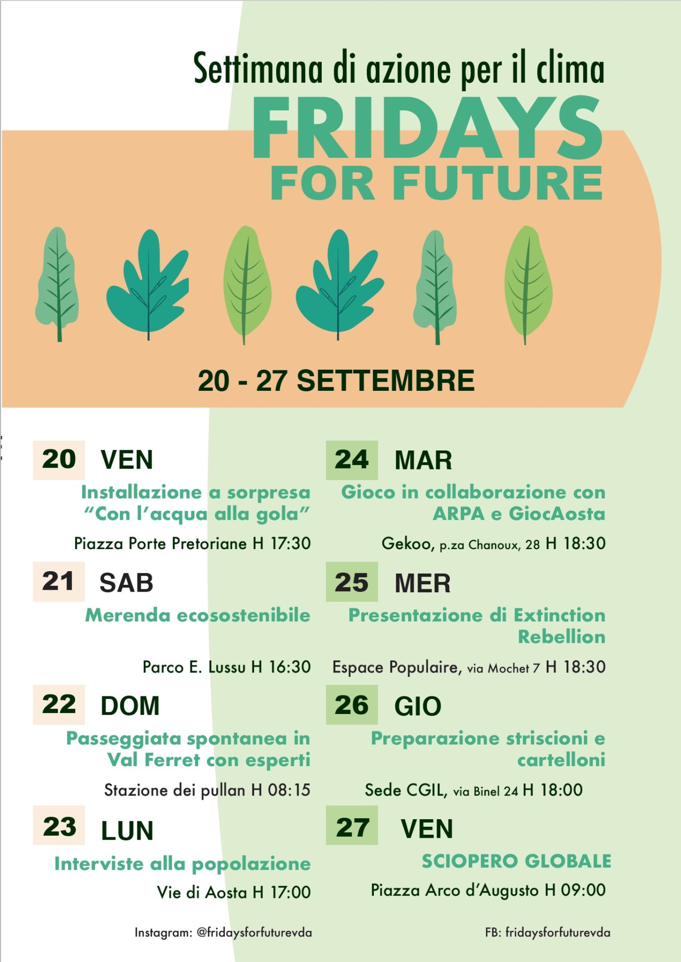 Lo sanno bene i ragazzi di Fridays For Future Valle d’Aosta che, dopo i due grandi “scioperi” aostani – il 15 marzo, prima, ed il 24 maggio poi – inaugurano ora la Settimana di azione per il clima, con otto eventi concentrati nel Capoluogo per tenere ben alto il messaggio d’allarme ambientale lanciato dalla loro ispiratrice, la sedicenne attivista svedese Greta Thunberg.