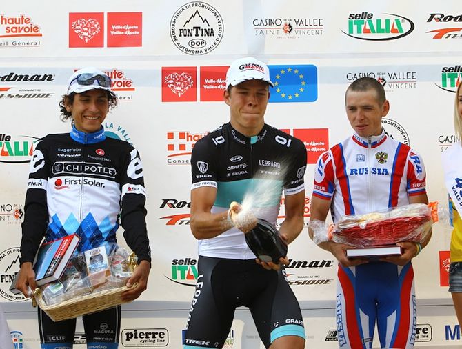 «Ho preso la fuga buona al mattino, poi sul San Pantaleone sono partito sperando di portare qualche corridore con me. Quando mi sono voltato ho visto il vuoto ed ho continuato. Avevo delle buone gambe e sono arrivato bene fino al traguardo». Bob Jungels ha vinto in solitaria questo pomeriggio ad Antey. Lunedì scorso al Forte di Bard aveva solo sfiorato il successo, lasciando la maglia gialla a Daniele Dall’Oste per appena cinque secondi. «Non sono qui per fare classifica – spiega il corridore lussemburghese della Leopard Trek – e infatti nelle altre tappe sono stato con il “gruppetto”. Oggi tra Aigle e Chatel me ne starò buono, magari proverò di nuovo a fare qualcosa domenica nella crono finale. Il mio obiettivo rimangono comunque i Campionati del Mondo di Valkenbourg di fine settembre».