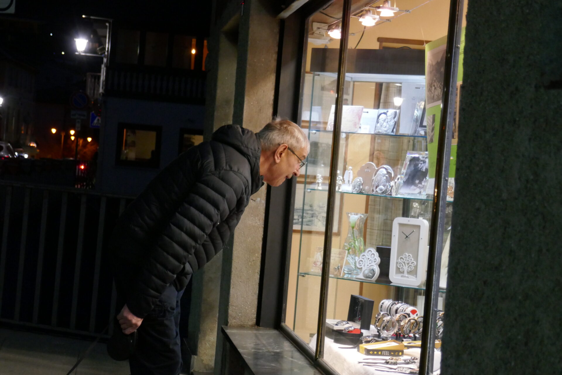 Tonino guarda gli oggetti e le immagini esposti nella vetrina