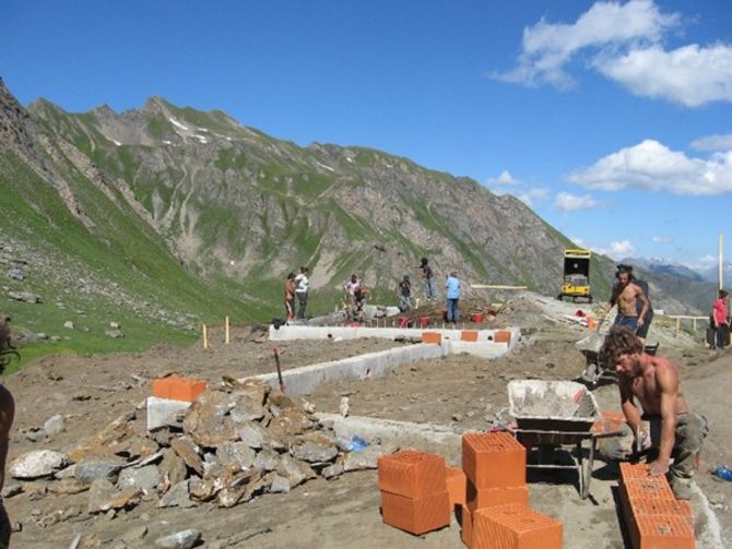 L’istallazione del cantiere è avvenuta all’inizio del mese di giugno. Il campo base, posto a quota 2.273 m è stato allestito nei pressi della “Tza di Merdeux” a circa 45 minuti di cammino dal rifugio. Una porzione dell’alpeggio è stata gentilmente concessa in uso dall’Amministrazione comunale per ospitare il dormitorio. Nelle immediate vicinanze è stata allestita la cucina e il refettorio. I ragazzi quotidianamente affrontano il percorso trasportando sulle loro spalle tutti i materiali occorrenti alla costruzione del nuovo rifugio. In questo modo, non utilizzando l’elicottero per il trasporto, viene riconosciuto loro un costo di manodopera che sarà devoluto, dagli stessi volontari, all’Associazione. Il tragitto di andata e ritorno viene eseguito per circa 4-5 volte al giorno. L’amministrazione regionale ha concesso un finanziamento di circa 1,5 milioni di euro e il diritto di superficie è stato ceduto dal Comune all’Associazione di volontariato COTOPAXI per una durata di 30 anni.