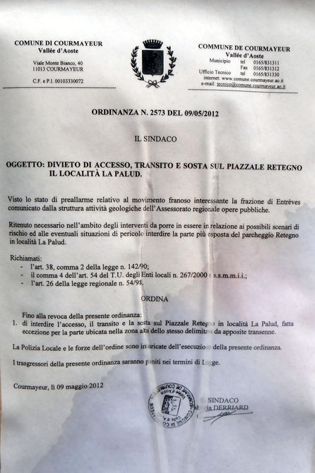 tornando da un giro sul monte Bianco ho trovato spiacevolmente una multa da 119,00 euro sul parabrezza del’auto parcheggiata sul piazzale Retegno in località La Palud vicino alla funivia. La contravvenzione indicava che avevo parcheggiato in area interdetta, ma guardandomi intorno c’erano almeno altre venti auto che avevano parcheggiato come me e tutte con la contravvenzione. Al di là di una fila di new jersey abbiamo trovato un cartello che indicava il divieto di accesso con indicata l’ordinanza n. 2573 del 09/05/2012, che però il giorno prima non avevamo notato a causa delle auto in manovra e quindi ignari siamo entrati nell’area interdetta. Ma come può un area dichiarata a rischio frana essere così facilmente accessibile alle auto compresi autocaravan che aveva soggiornato la notte? Questa domanda siamo andati a farla alla Polizia Municipale che ci ha semplicemente risposto che c’era un cartello che indicava il divieto. Ma facendo loro notare che il cartello in questione poteva eventualmente essere messo in mezzo all’ingresso all’area interdetta così la segnalazione sarebbe stata più evidente e comunque non sarebbe stato possibile entrare. La situazione che avevamo trovato era di un enorme area parcheggio chiusa nella parte antistante la strada da una fila di new jersey interrotti in un tratto di quattro metri proprio in corrispondenza dell’ingresso al piazzale con un cartello di divieto messo in disparte che nel nostro caso era nascosto da auto in manovra. Ci è stato quindi risposto che potevamo contestare la multa, ma a loro non interessava niente altro perché c’era un cartello con tanto di ordinanza.