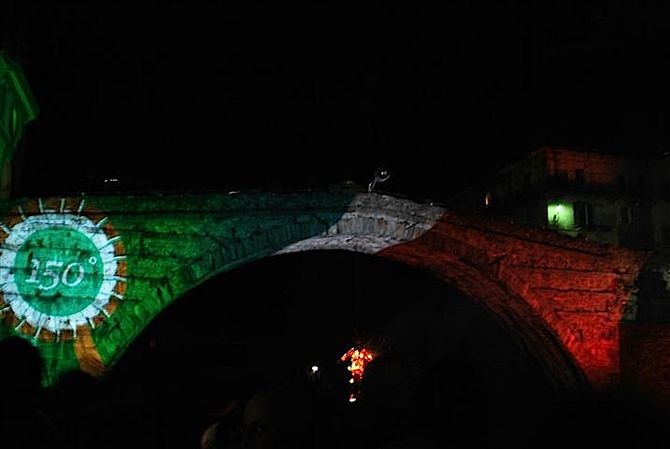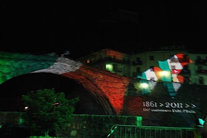 Sullo sfondo del Ponte romano, ha preso vita un suggestivo spettacolo di musica e fuochi d’artificio, di circa 30 minuti, allestito dalla Pyroemotions di Andrea Scarpato. Non solo commemorazione degli eventi storici della fondazione di Pont Saint Martin, quest’anno, ma anche un omaggio ai 150 anni dell’unità d’Italia. Sulle note dell’Inno di Mameli il Ponte e il suo comune si sono tinti di un’inedita luce tricolore.