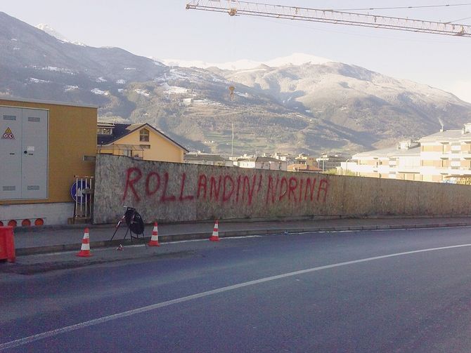 Non è ancora stato completato ed è già vittima di atti di vandalismo e inciviltà. Questa mattina, sulle due pareti in marmo del parco dell’area megalitica di Saint-Martin de Corléans è apparsa una grande scritta (speculare, sulle due pareti, ndr), in rosso, che tira in ballo il presidente della Regione, Augusto Rollandin. La scritta, apparsa anche sulla recinzione del cantiere dell’ex Residence Mont Blanc, in Viale Gran San Bernardo recita “ROLLANDIN ‘NDRINA”. Quest’ultima parola è un sinonimo di "cosca malavitosa", nel gergo calabrese della ‘Ndrangheta.