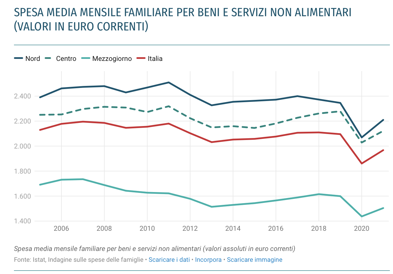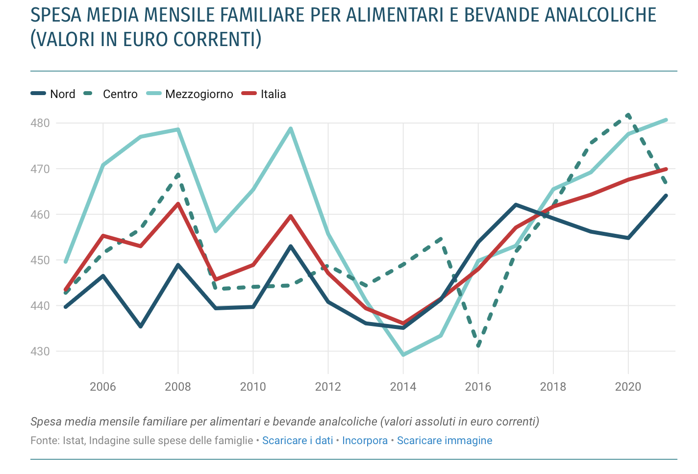 A fronte di una spesa media mensile pari a 2.437 euro (+4,7% rispetto al 2020), di cui circa un quarto destinata ad alimenti e tre quarti destinata per contro al consumo di beni e servizi non alimentari, la povertà assoluta permane sugli elevati valori raggiunti nel 2020, coinvolgendo 1,9 milioni di famiglie (7,5%) e 5,6 milioni di individui (9,4%).