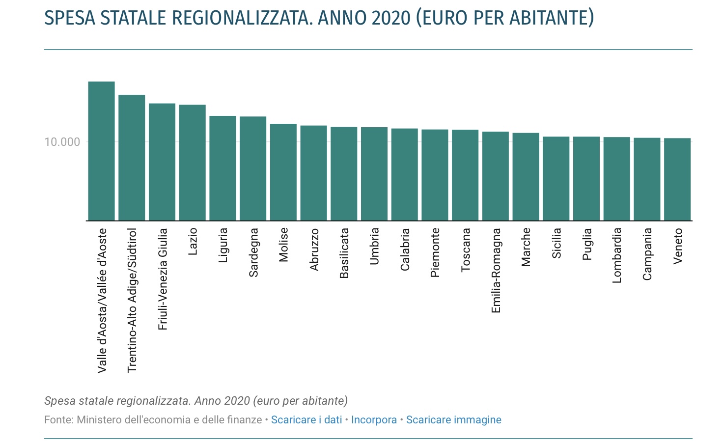 Più ingente ancora risulta la spesa statale per abitante regionalizzata, con la Valle d’Aosta che emerge nella lista delle regioni con i più alti costi statali per abitante, 17.600 euro; seguono il secondo posto del Trentino-Alto Adige (15.900 mila euro), e il terzo posto del Friuli-Venezia Giulia e Lazio (tra i 14 mila e i 15 mila euro).