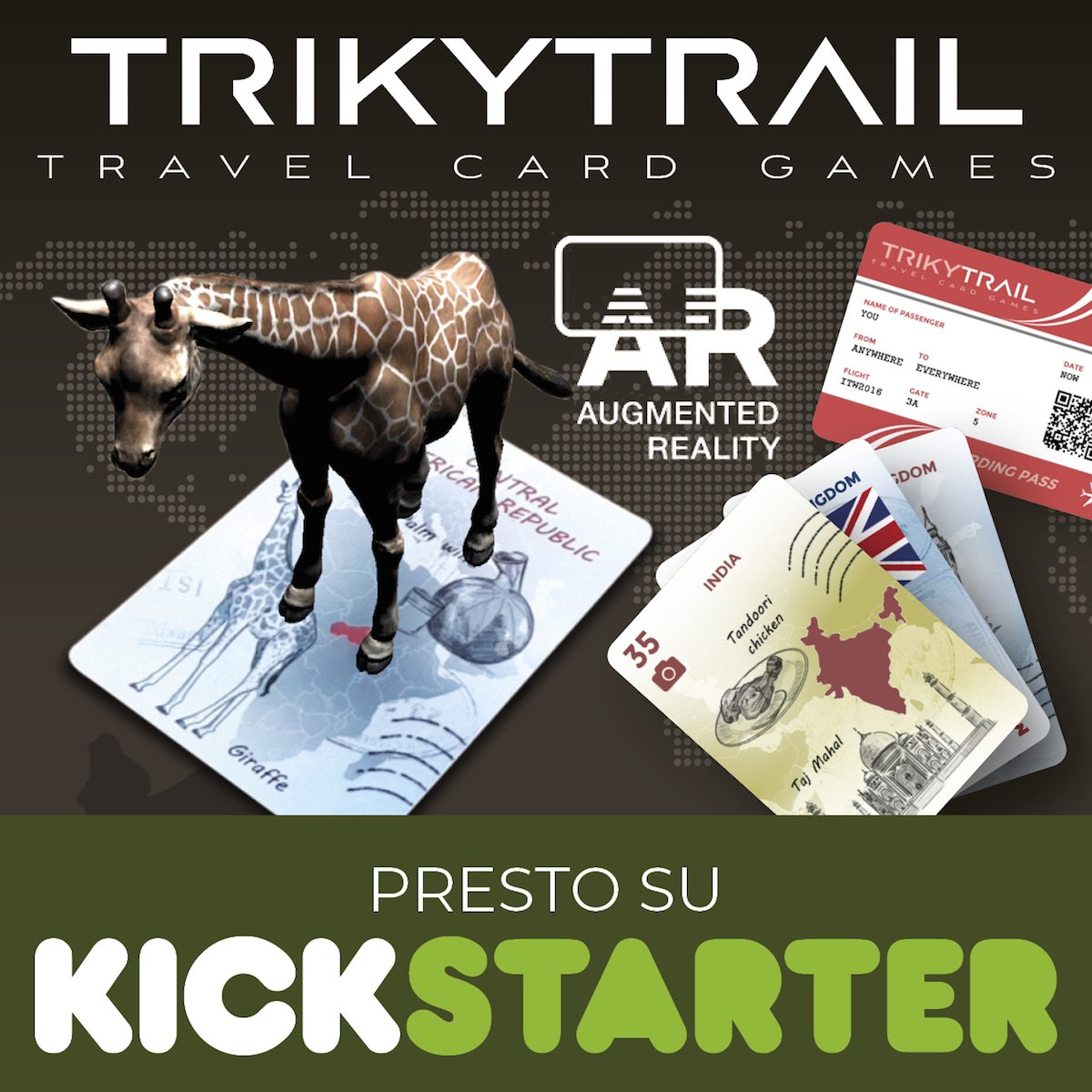 Un gioco di carte tradizionale – i mazzi possono esser utilizzati anche per la scopa, il poker o i tarocchi – ma che sfrutta anche le potenzialità dell’era digitale. Sul retro di ciascuna carta è presente un QR CODE attraverso il quale è possibile accedere ad un sito ricco di informazioni sul Paese a cui la carta fa riferimento. Inoltre scaricando l’App del gioco, attraverso lo smartphone è possibile viaggiare, almeno virtualmente, grazie alla realtà aumentata.