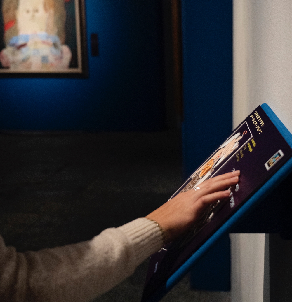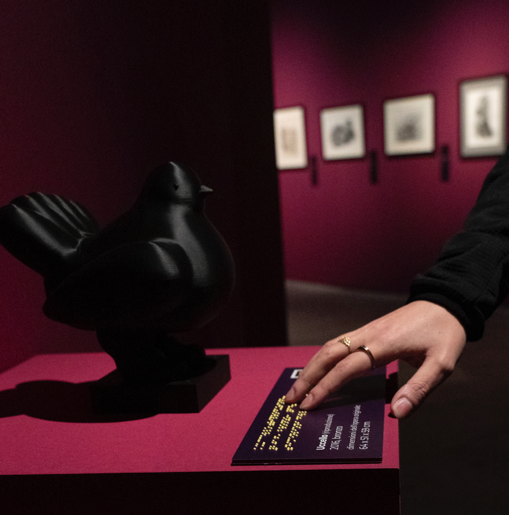 I sei pannelli, uno per ogni sezione della mostra, riproducono in forma tattile un’opera ritenuta rappresentativa del tema trattato permettendo alle persone cieche o ipovedenti di comprendere la struttura visiva dell’opera. Tutte le riproduzioni sono poi accompagnate da didascalie in Braille e in caratteri ad alta leggibilità. Le informazioni descrittive delle opere sono poi fornite tramite specifici codici QR Navilens, che completano e potenziano l’esperienza tattile.