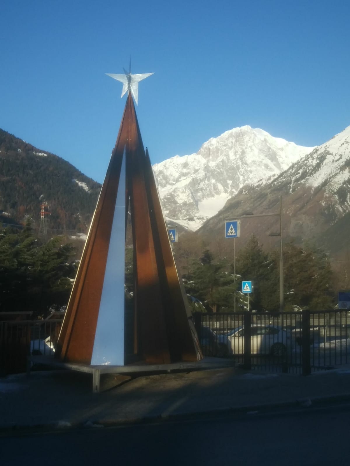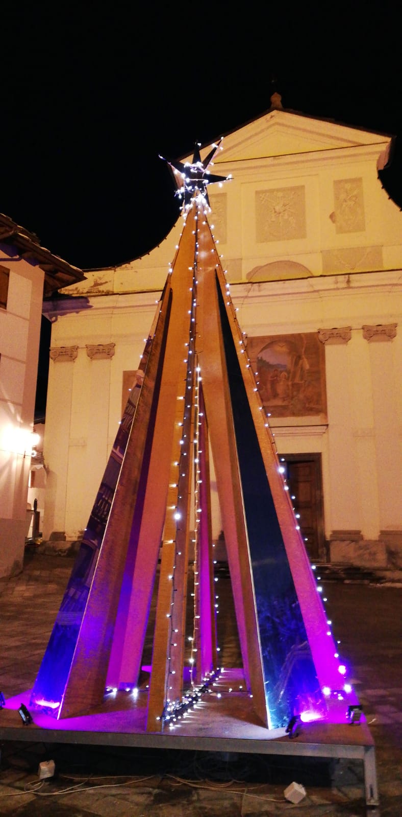Un albero stilizzato in acciaio corten e specchi – creato dal fabbro Piero Nigra – campeggia sul sagrato della Chiesa di San Cassiano, a La Salle.