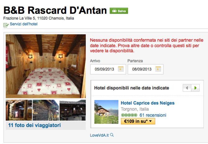 Questi ultimi, a loro insaputa, sono stati comunque agganciati su Tripadvisor dal sistema di ricerca del Valle d’Aosta booking. Risultato: sulla pagina della struttura dove prima comparivano solo le recensioni dei viaggiatori, ora viene fuori una schermata di prenotazione che consegna all’ignaro viaggiatore, in cerca di camere libere, la scritta: “Nessuna disponibilità confermata nei siti dei partner nelle date indicate. Prova altre date o controlla questi siti per vedere la disponibilità.” Appena sotto un piccolo box suggerisce un’altra struttura, consigliata da Tripadvisor per le date indicate, fra quelle associate a sistemi di ricerca come Vdabooking o Booking.com. Nella pagina compare inoltre la scritta lovevda con una piccola lente di ingrandimento, cliccando la quale si viene rimandati al “Valle d’Aosta booking” che ovviamente, non avendo la struttura come associata, non potrà fare altr0 che segnalare all’internauta: “Nessun risultato. Cambia i criteri di questa ricerca”.