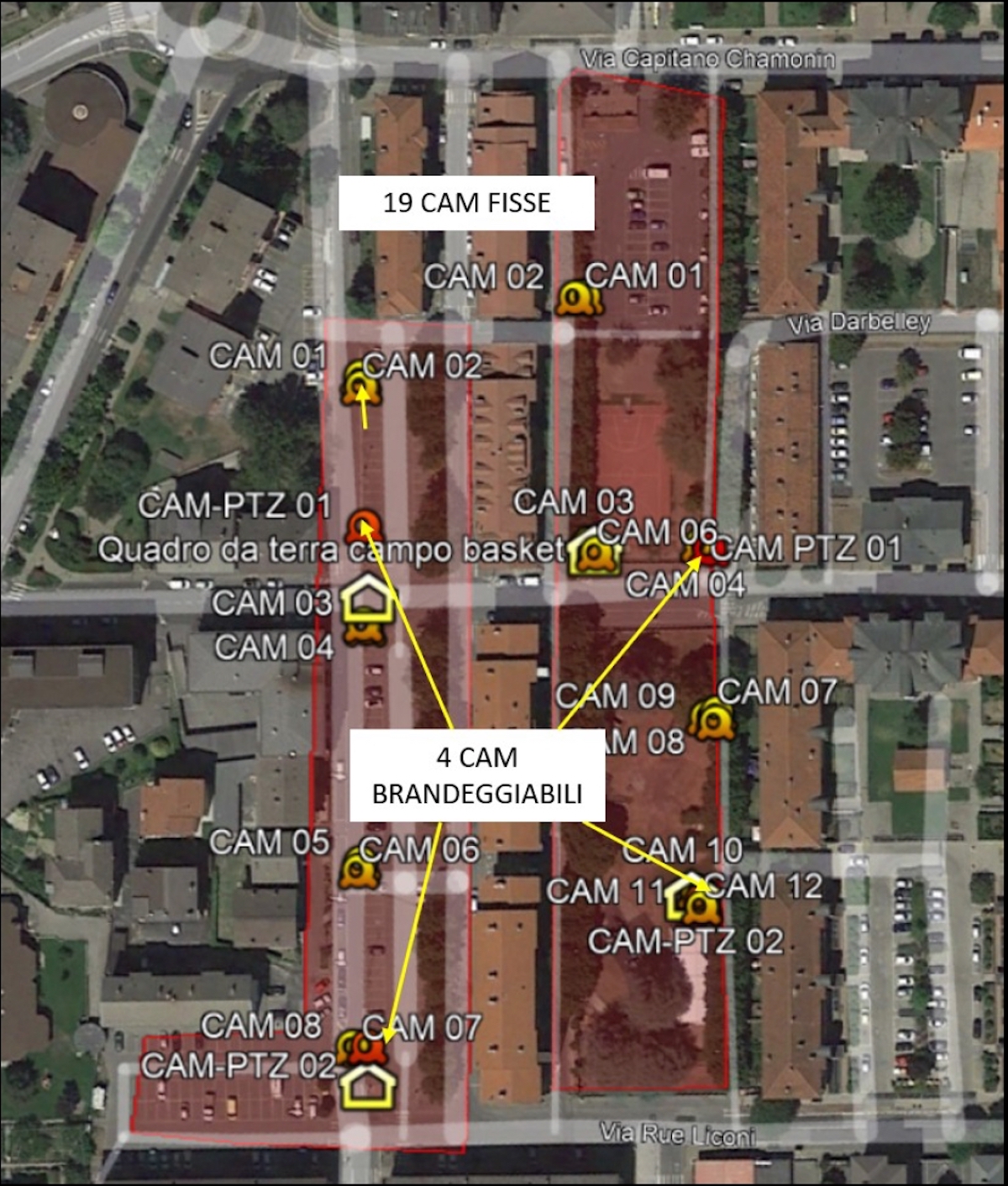 In particolare, saranno videosorvegliate via Elter zona nord, tra via Cavagnet e via Chamonin, le zone est (grattacieli e nuova rotonda) e ovest di via Chamonin, la rotonda di via Monte Grivola in corrispondenza di corso Saint-Martin-de-Corléans, le Scuole “Lexert”, il parcheggio all’angolo tra via Chamonin e via Vuillerminaz, i giardinetti e il campo da basket della stessa via e l’area adibita a sede mercatale e parcheggio di via Mont Fallère e via Monte Cervino.