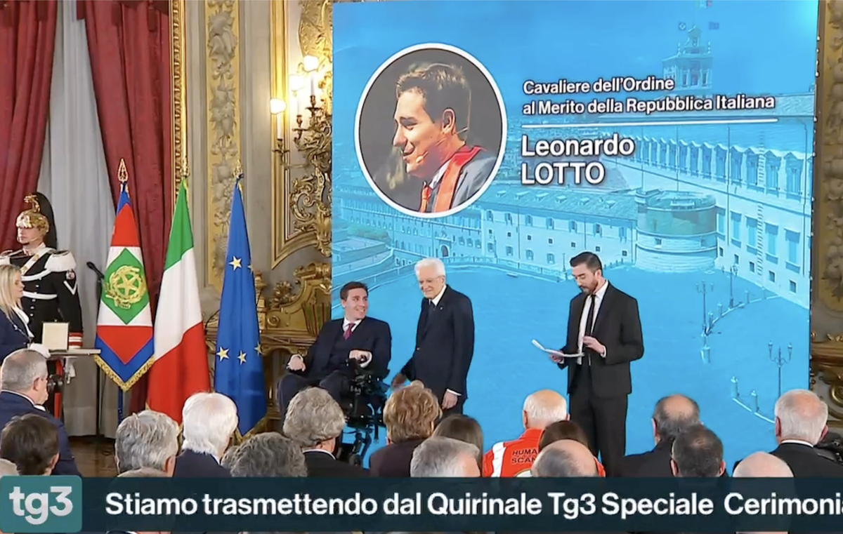 Leonardo Lotto è Cavaliere dell’Ordine al merito della Repubblica italiana. Durante la cerimonia di questo pomeriggio, svoltasi al Quirinale e trasmessa con una diretta speciale al Tg3 e su RaiPlay, Leonardo è stato accolto dal Presidente della Repubblica Sergio Mattarella che gli ha consegnato la medaglia e la pergamena di Cavaliere dell’Ordine al merito della Repubblica italiana.
