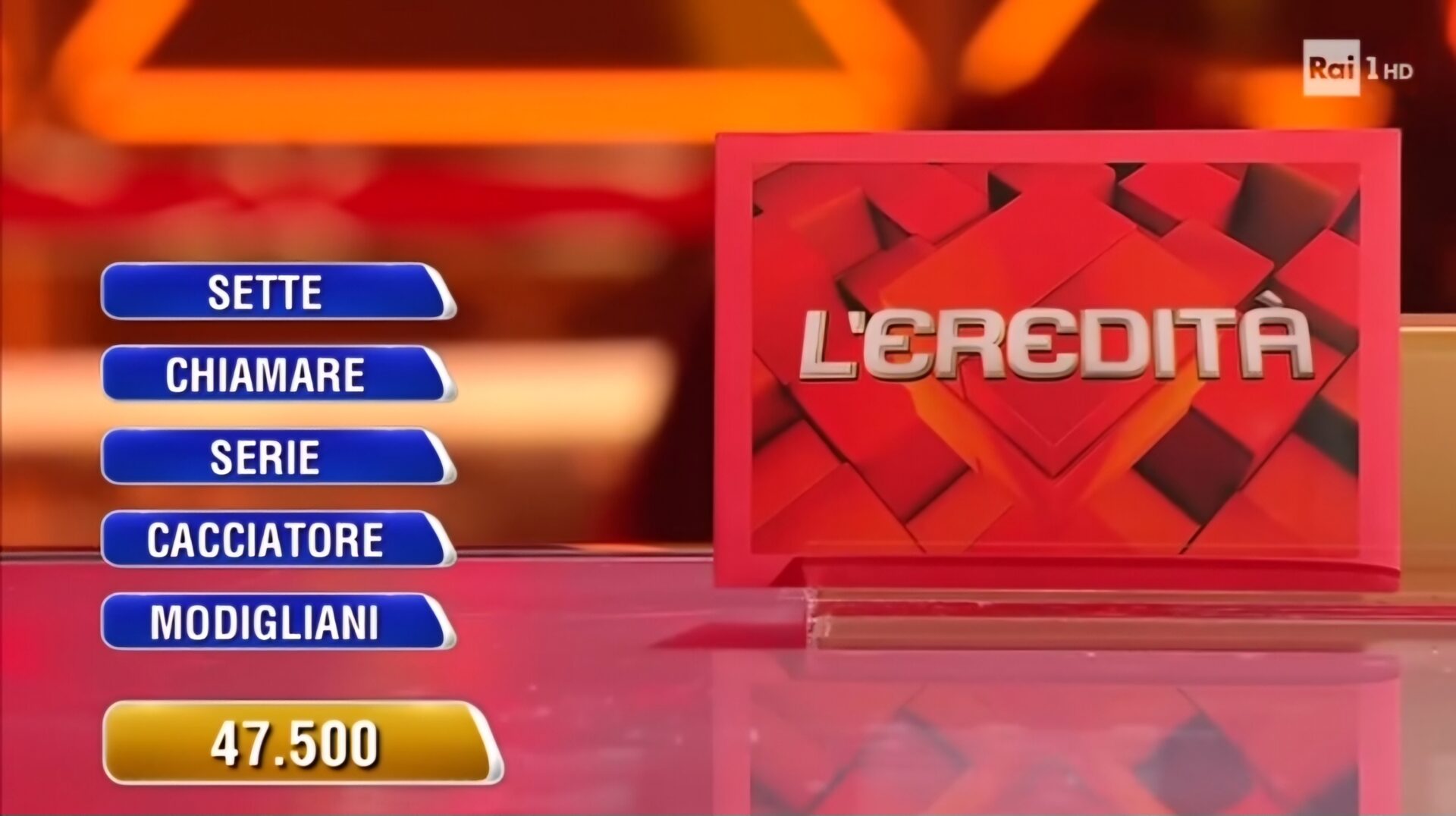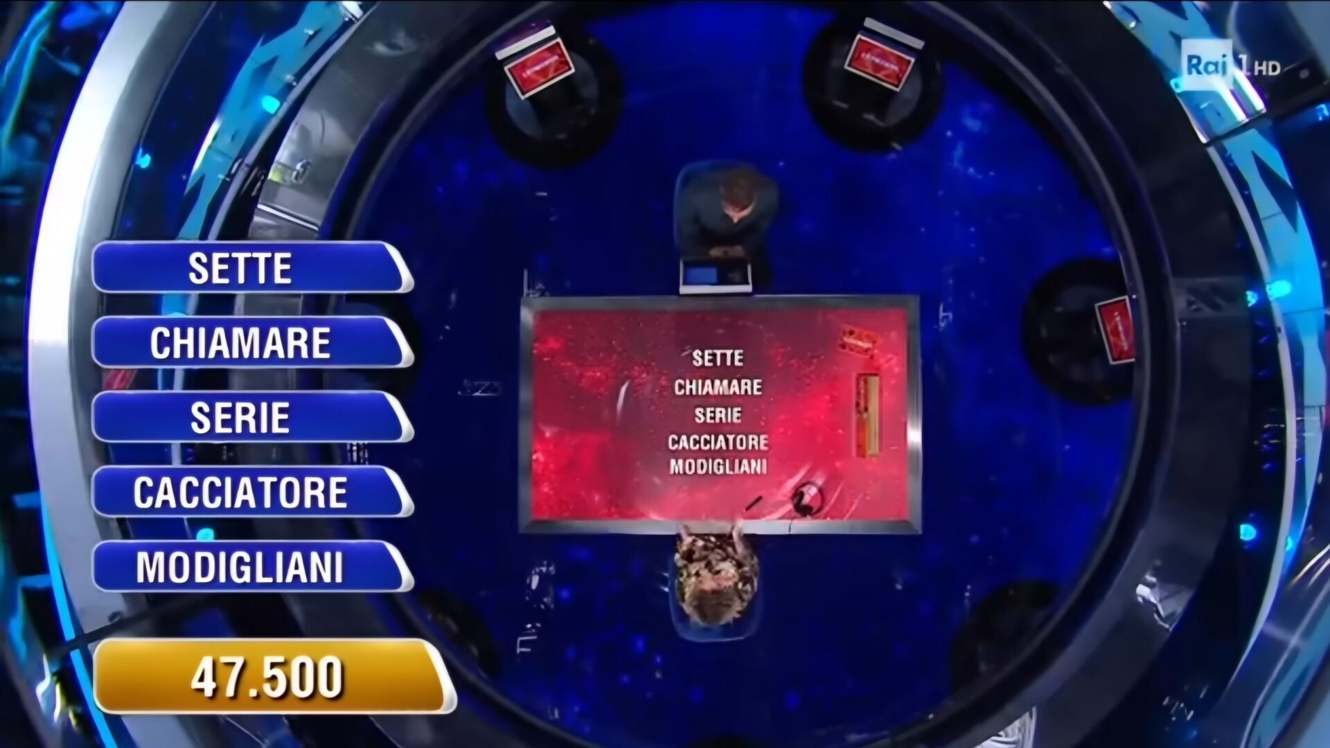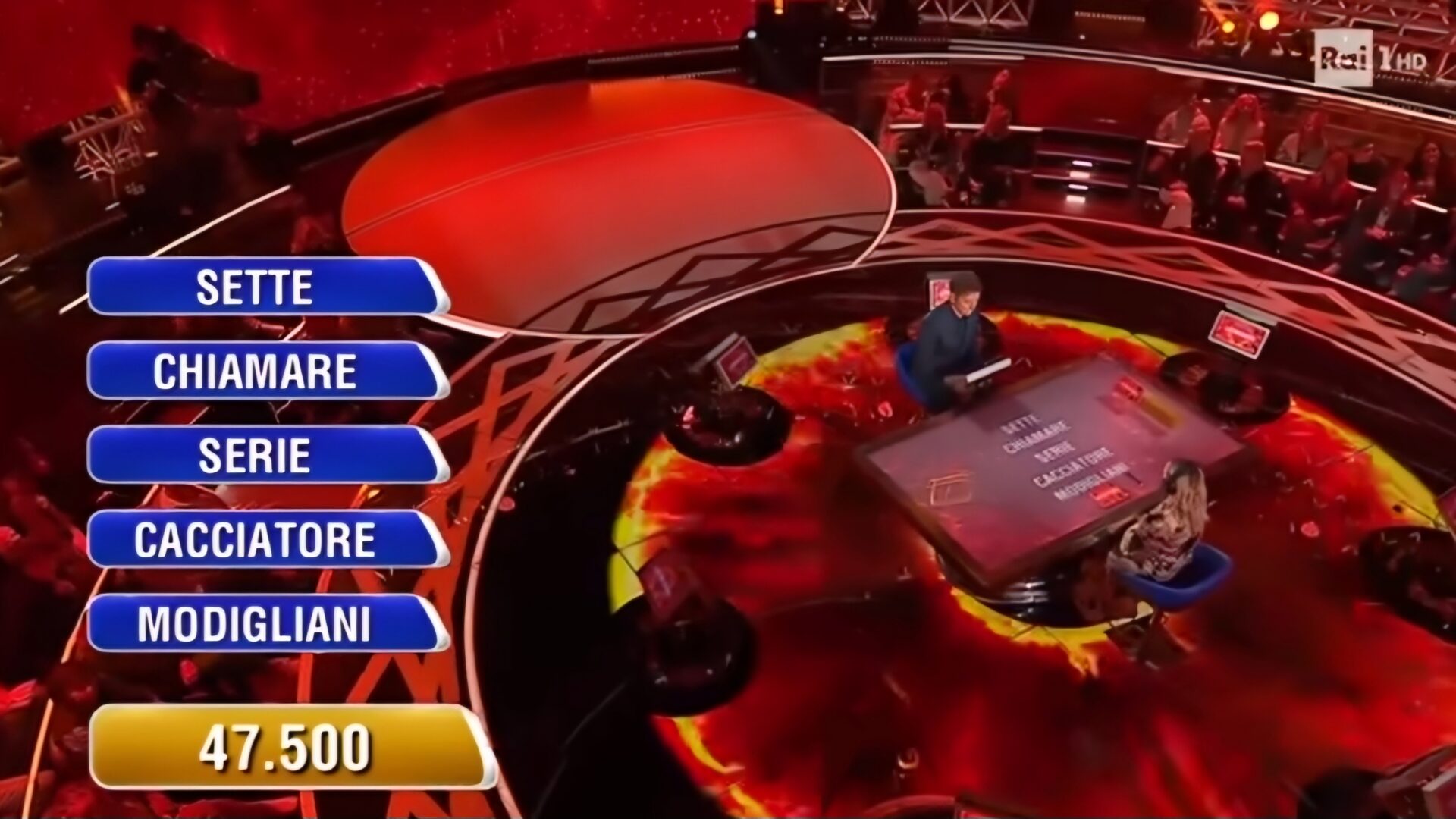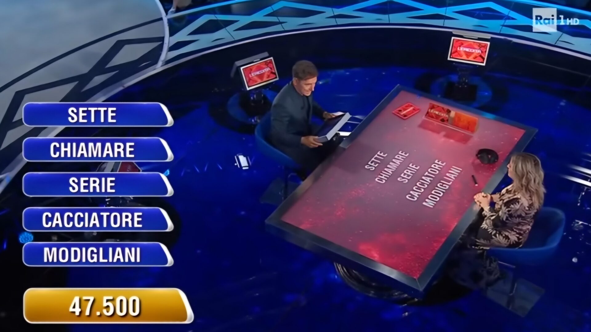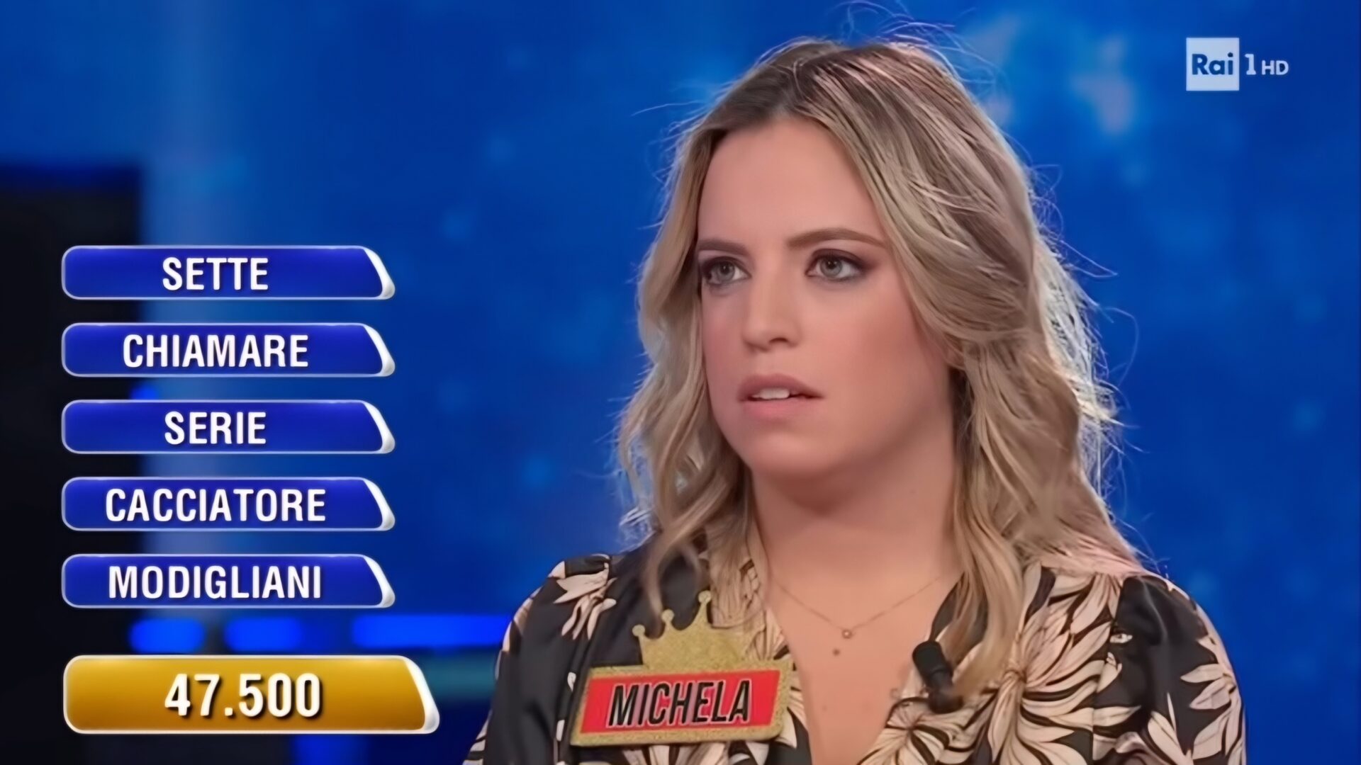Cinque indizi – Sette, Chiamare, Serie, Cacciatore, Modigliani – e un minuto di tempo per azzeccare la parola giusta (che Michela è riuscita a indovinare, ndr): Teste. La concorrente è arrivata al gioco finale con 190 mila euro, dimezzati per ben due volte nella selezione dei termini chiave.