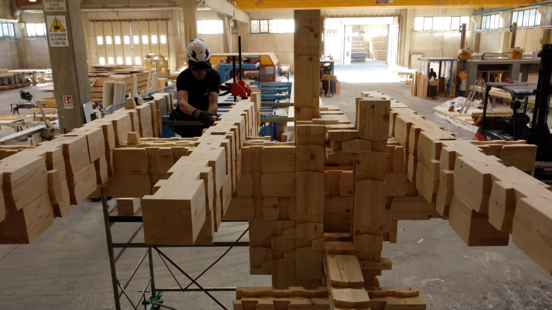 Matteo è da sempre appassionato delle costruzioni in legno alpino: “Avevo l’intenzione di tradurre in termini robotici l’architettura tradizionale alpina che mi ha sempre affascinato. Questa tecnica di costruzione, che ho ideato, si basa sul blocco e non su travi o pilastri, come un sistema di blocchi Lego. La difficoltà maggiore è la mole di calcolo che vi è alla base, ma l’evoluzione della programmazione sta agevolando anche queste complessità. Questo tipo di progettazione modulare permette di creare una vera architettura per il riuso sostenibile“.