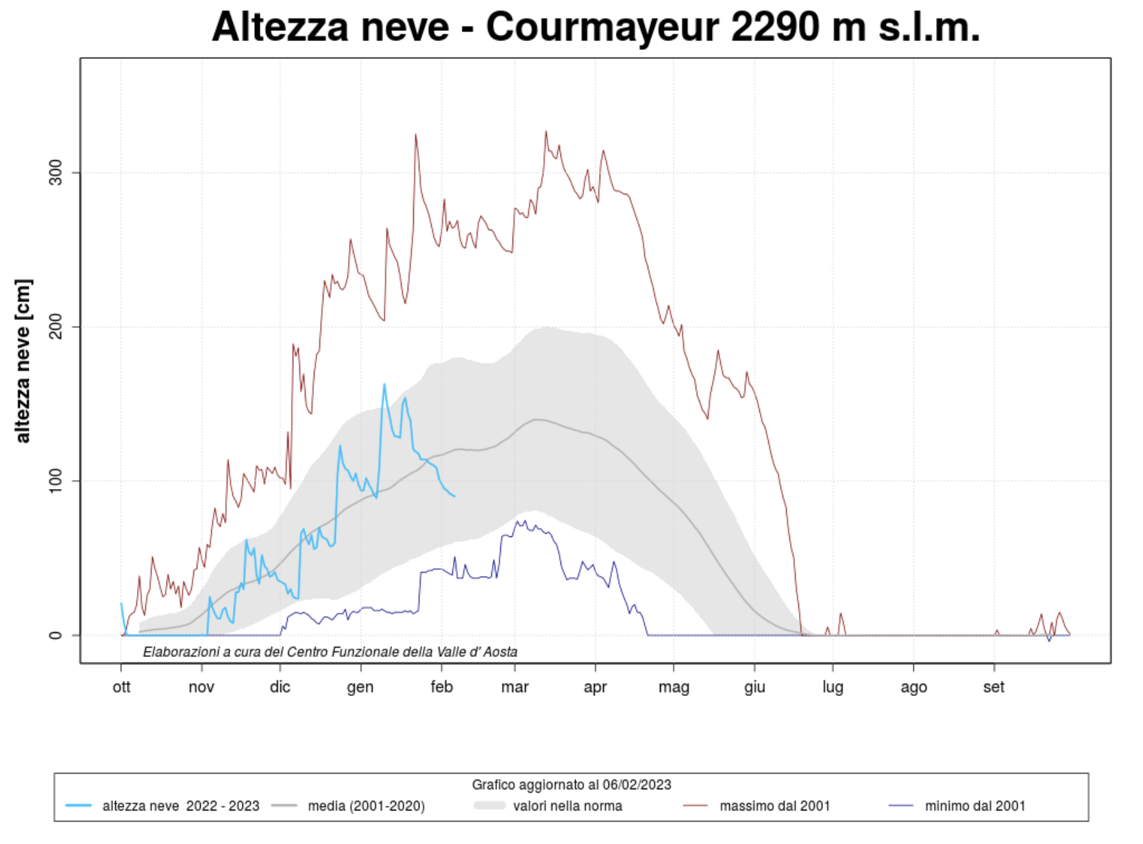 Parallelamente, accanto ai fenomeni piovosi di gran lunga inferiori alle statistiche stagionale occorsi ad Aosta, la neve in quota si avvicina ai livelli degli anni passati o raggiunge livelli superiori come è il caso per esempio di Courmayeur.