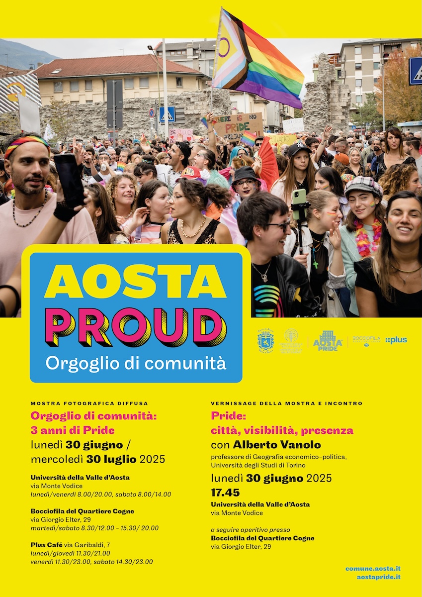 “Quando, nel 2022, il Comitato Aosta Pride ha chiesto il patrocinio e condiviso con l’Amministrazione comunale il progetto, abbiamo fatto la scelta – consapevole – nella convinzione che la comunità valdostana fosse pronta ad accogliere un evento come il Pride. Oggi quel cammino prende una nuova forma con ‘Aosta Proud’, una mostra fotografica diffusa che vuole restituire alla comunità la bellezza, le riflessioni, il coinvolgimento e i passi avanti vissuti in questi tre anni di Pride” dichiara Clotilde Forcellati, assessora alle Politiche sociali del Comune di Aosta, durante la conferenza stampa di presentazione dell’evento. I luoghi simbolici scelti per ospitare l’esposizione sono la Bocciofila del Quartiere Cogne, il Plus café e l’Università, il cuore della mostra.