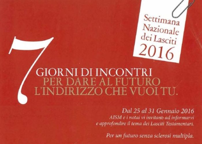 Sensibilizzare, informare e soprattutto offrire un servizio di consulenza in materia successoria. Sono questi gli obiettivi della della "Settimana Nazionale dei Lasciti" promossa dall’Associazione Italiana Sclerosi Multipla e dalla sua Fondazione con il patrocinio e la collaborazione del Consiglio Nazionale del Notariato e della Regione Autonoma Valle d’Aost, che prenderà il via lunedì 25 gennaio con l’incontro "Ne parliamo con i notai", in programma alle ore 20.30 presso la Sala Conferenze della Biblioteca Regionale di Aosta.
