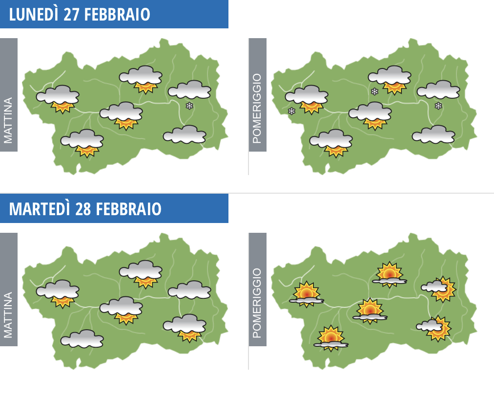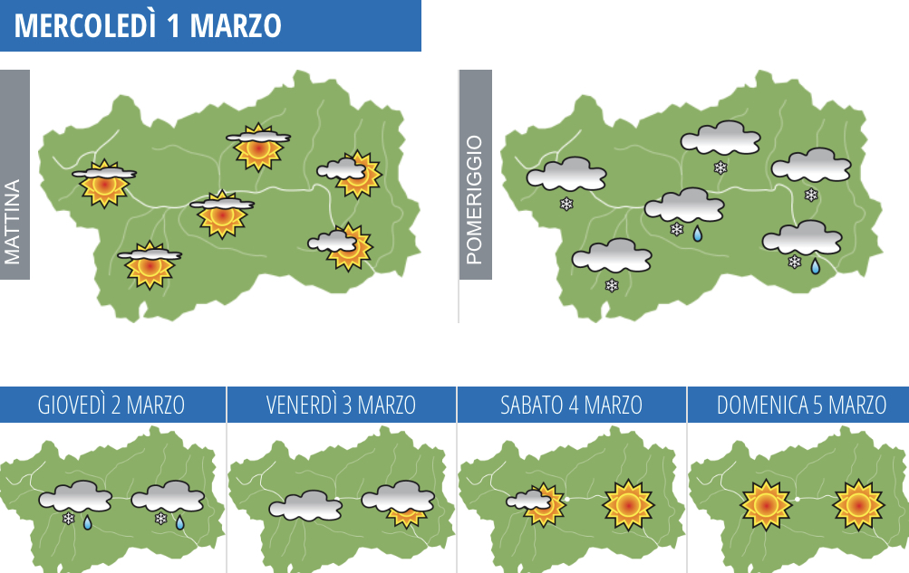 “Tra oggi e domani le giornate saranno prevalentemente asciutte con nuvolosità compatta in graduale dissolvimento sino quasi al sereno – spiegano dall’ufficio meteorologico del Centro funzionale della Valle d’Aosta -. Nonostante la situazione sia ancora volubile a causa di una bolla di bassa pressione di grandi dimensioni direttamente sulla regione, possiamo ipotizzare alcune deboli nevicate tra il pomeriggio di mercoledì 1º marzo e la mattinata di giovedì 2 marzo di altezza compresa tra i 5 centimetri e i 10 centimetri”.