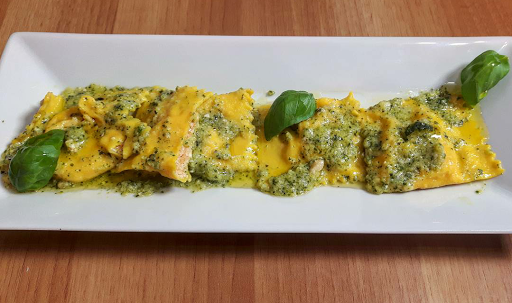 A questo punto chiudi la sfoglia facendo una leggera pressione attorno al ripieno per unire bene la pasta. Taglia i ravioli con una rotella tagliapasta, quindi falli asciugare un pochino, tenendoli ben distanziati tra loro. Cuocili in acqua bollente salata e scolali non appena salgono a galla. Condisci con il pesto di zucchine e servi caldo.